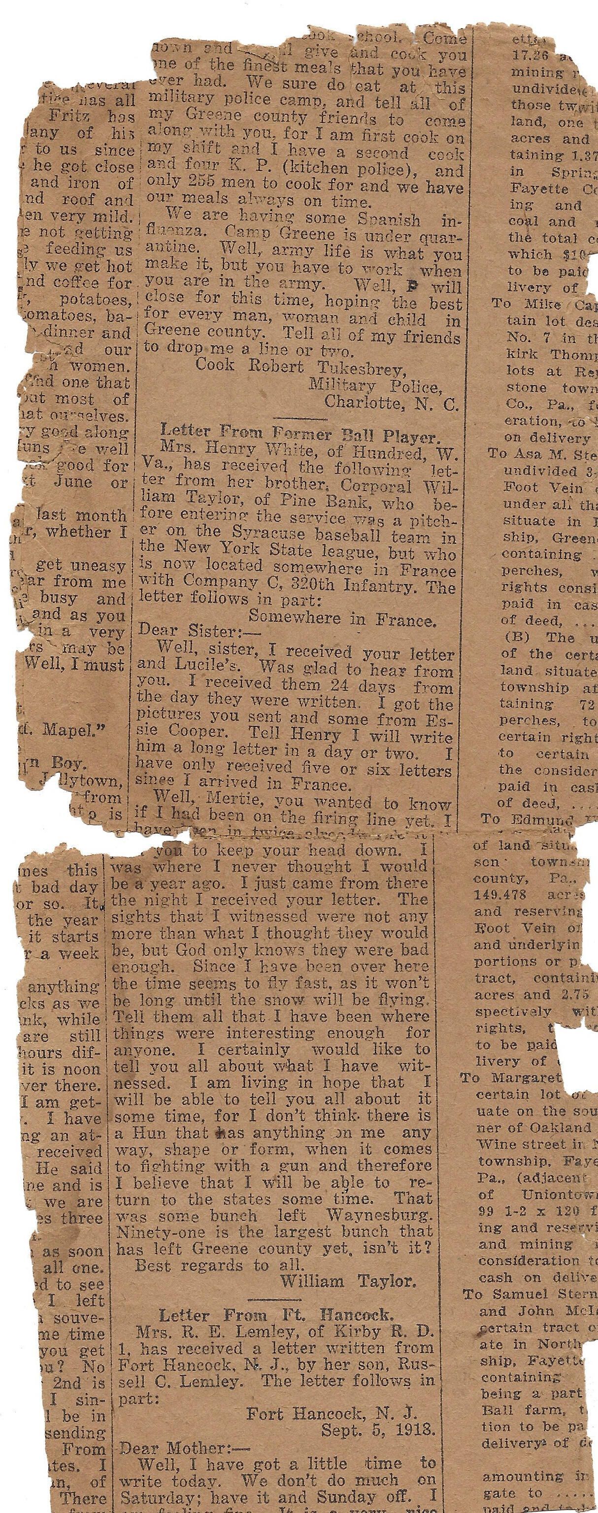 "Mrs. Henry White, of Hundred, W.Va., has received the following letter from her brother, Corporal William Taylor, of Pine Bank who before entering the service was a pitcher on the Syracuse baseball team in the New York State league, but, who is now located somewhere in France with Company C, 320th Infantry. The letter follows in part: