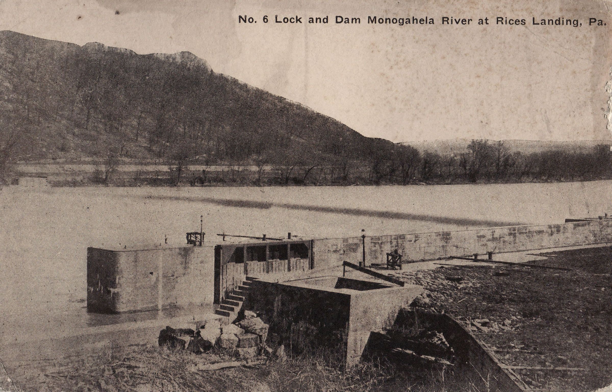 SOURCE CITATION: Real-photo postcard of No. 6 Lock and Dam on the Monongahela River at Rices Landing, Jefferson Township, Greene County, Pennsylvania; circa 1900-1920; item no. RUSH-AN001-0007-0011, Walter Markiewich Postcard Collection, shared by Brice and Linda Rush; Greene Connections Archives Project (GreeneConnections.com).