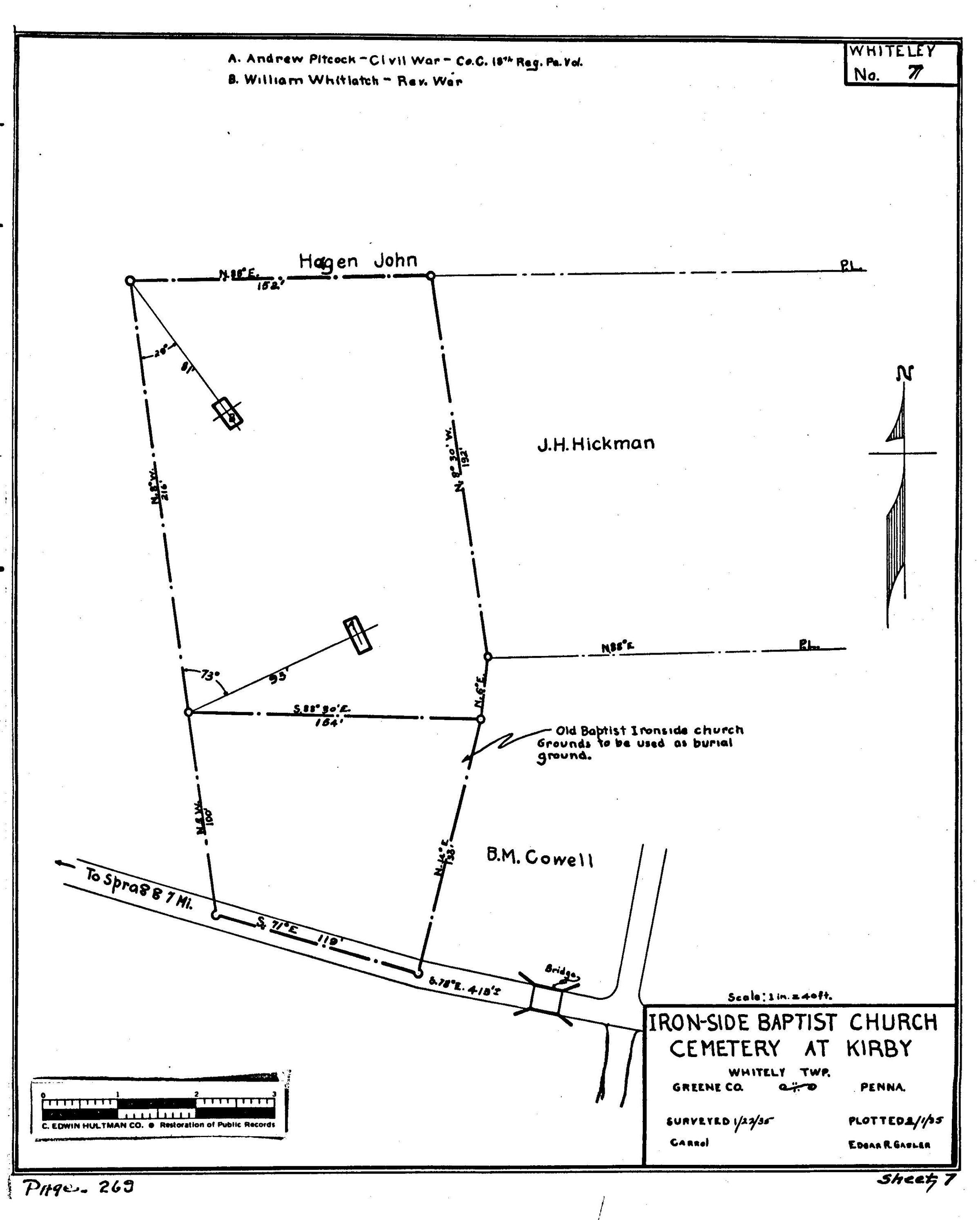 SOURCE CITATION: WPA Cemetery Plat - Pennsylvania - Greene County - Whiteley Township - Iron-side Baptist Church Cemetery (1935); item no. 2016.3.113, Cemetery Plat (WPA) Collection, surveyed by Works Projects Administration, copy on file at the Clerk of Courts Office; Greene County Courthouse, Greene Connections Archives Project (GreeneConnections.com).