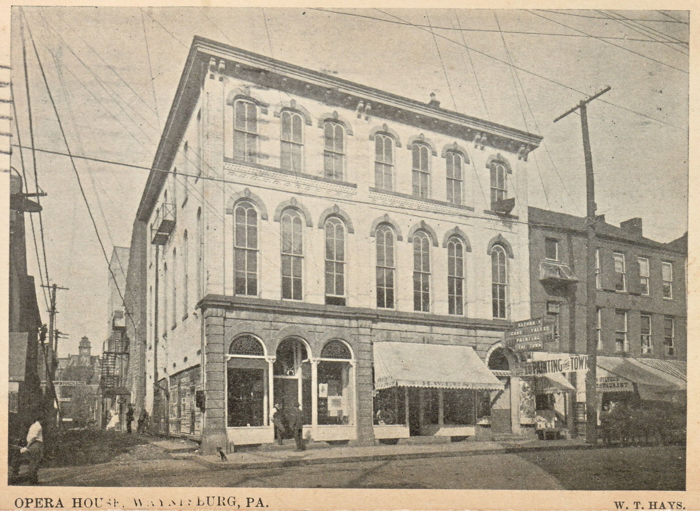 Source Citation: Opera House on High Street in Waynesburg, Greene County, Pennsylvania; printed by W. T. Hays, Waynesburg, Pa.; item no. GCHS-AN027-0001-0087, Greene County Historical Society Collection; Greene Connections Archives Project (GreeneConnections.com).