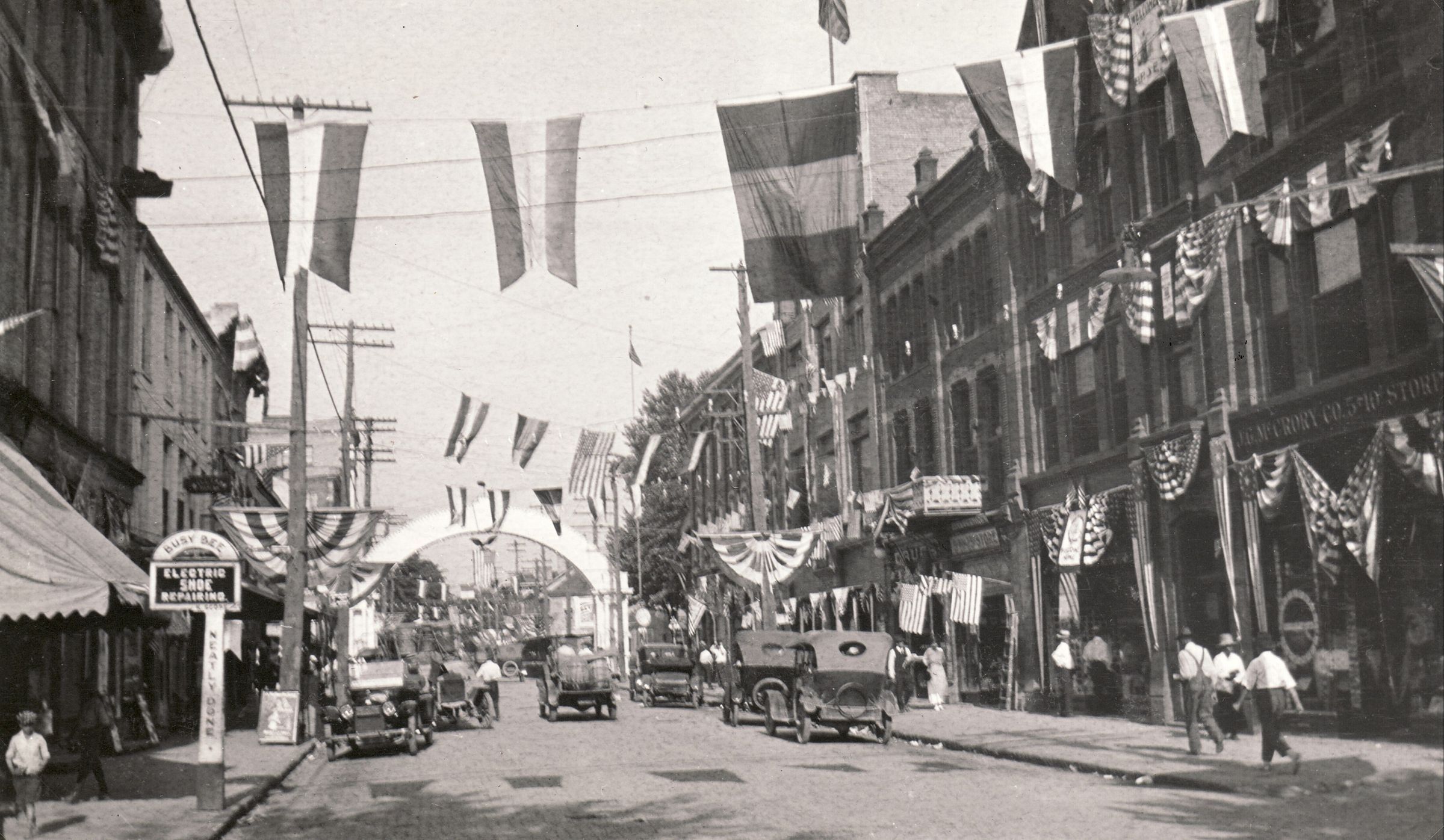 Taken on High Street, looking east toward Washington Street where a Victory Arch was built for the event, in Waynesburg, Greene County, Pennsylvania.