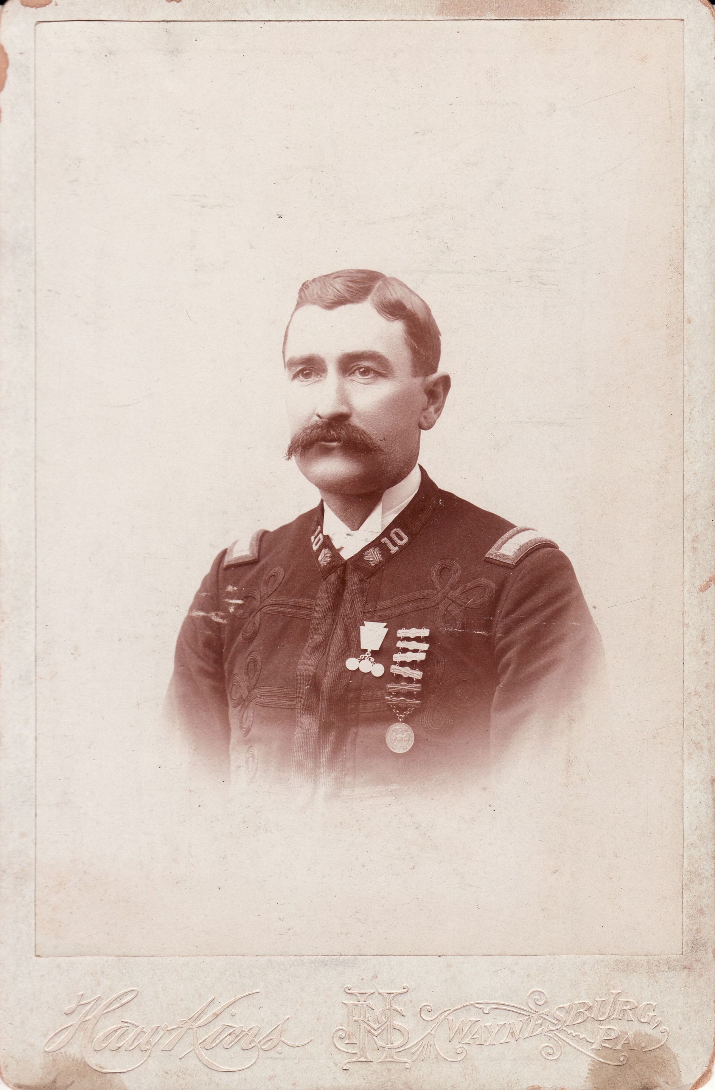 Source Citation: Pauley-Thompson Album, Loose Images - John Flenniken Pauley Sr. [1858-1929], Company K, 10th Pennsylvania Volunteer Infantry; circa 1890-1900, image by F. S. Hawkins, Waynesburg, Pa.; item no. CGSP_AN002_0058, Cornerstone Genealogical Society Collection; Greene Connections Archives Project (GreeneConnections.com).