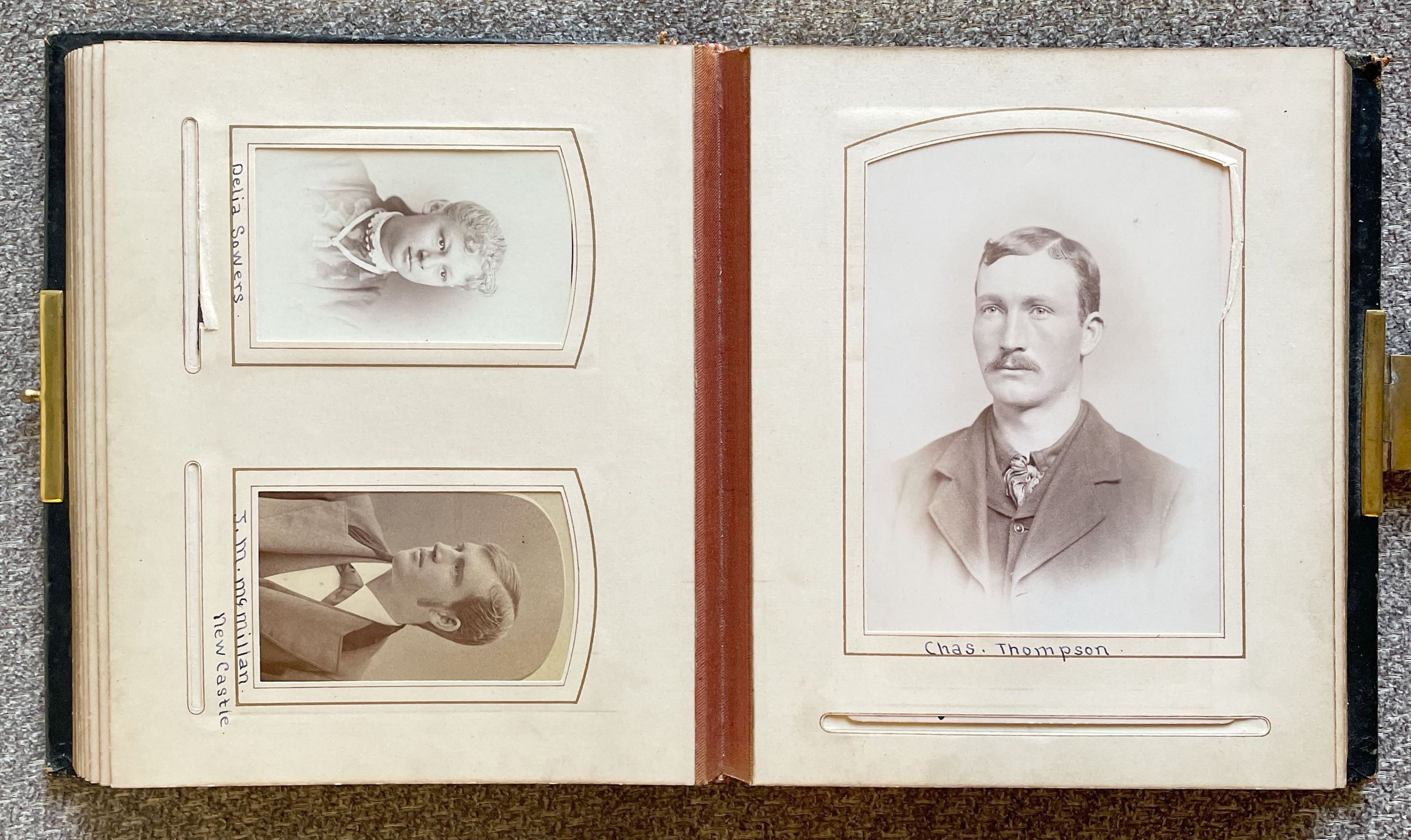 The Pauley-Thompson Album once belonged to the family of John Flenniken Pauley [1858-1929] and his wife, Margaret Virginia Thompson [1855-1937]. The album was found in a building set for demolition and was donated to the Cornerstone Genealogical Society (144 E. Greene St., PO Box 547; Waynesburg, Pennsylvania 15370). Shared with the Greene Connections: Greene County, Pennsylvania Archives Project in 2007.