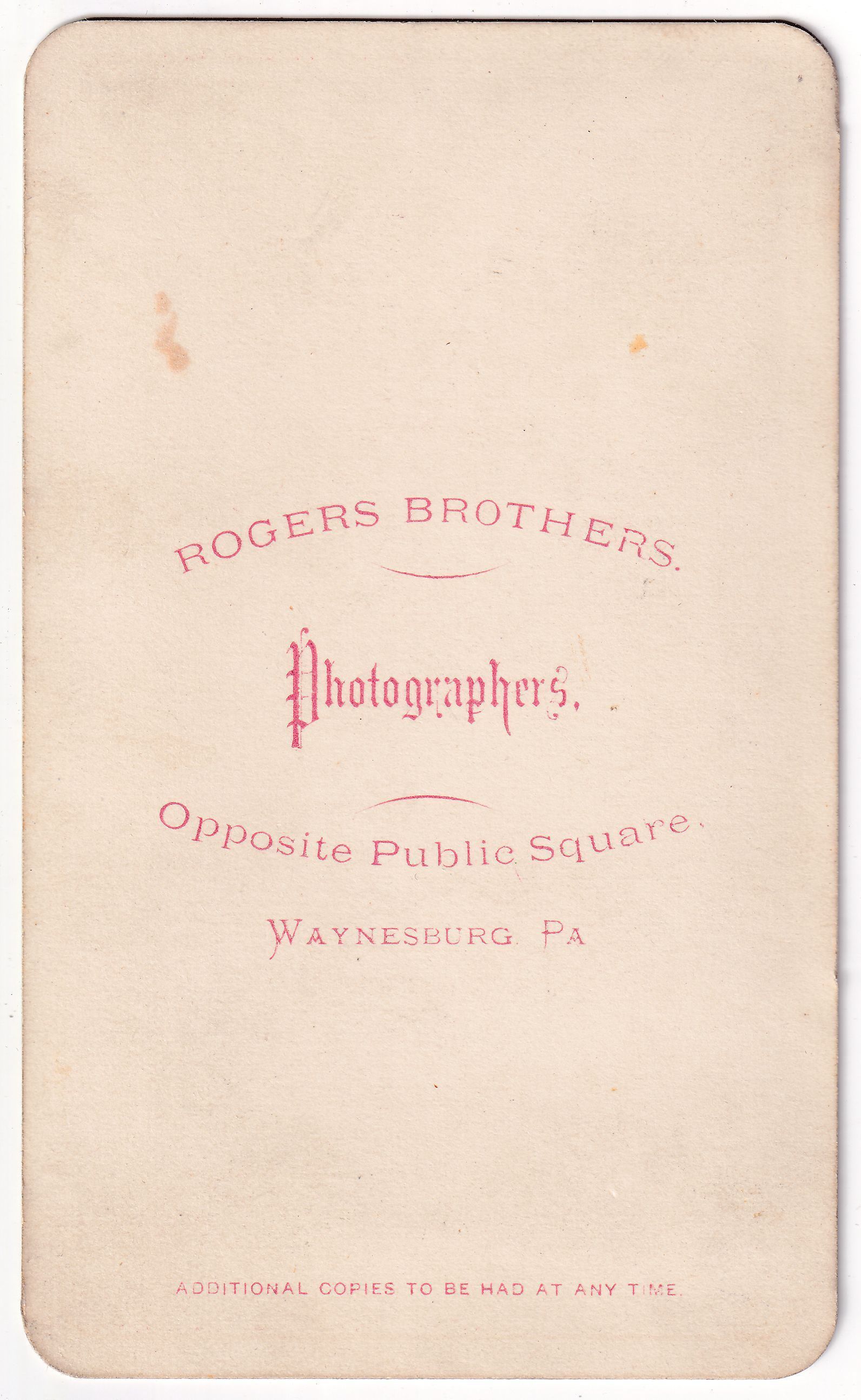 Source Citation: Pauley-Thompson Album, Photo 28 - Margaret (Bowler) Thompson; circa 1880-1890, image by Rogers Brothers, Photographers, Opposite Public Square, Waynesburg, Pa.; item no. CGSP_AN002_0028, Cornerstone Genealogical Society Collection, Greene Connections Archives Project (GreeneConnections.com).