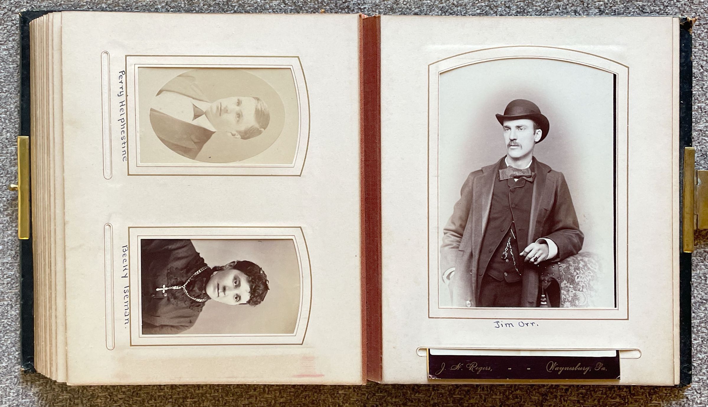 The Pauley-Thompson Album once belonged to the family of John Flenniken Pauley [1858-1929] and his wife, Margaret Virginia Thompson [1855-1937]. The album was found in a building set for demolition and was donated to the Cornerstone Genealogical Society (144 E. Greene St., PO Box 547; Waynesburg, Pennsylvania 15370). Shared with the Greene Connections: Greene County, Pennsylvania Archives Project in 2007.
