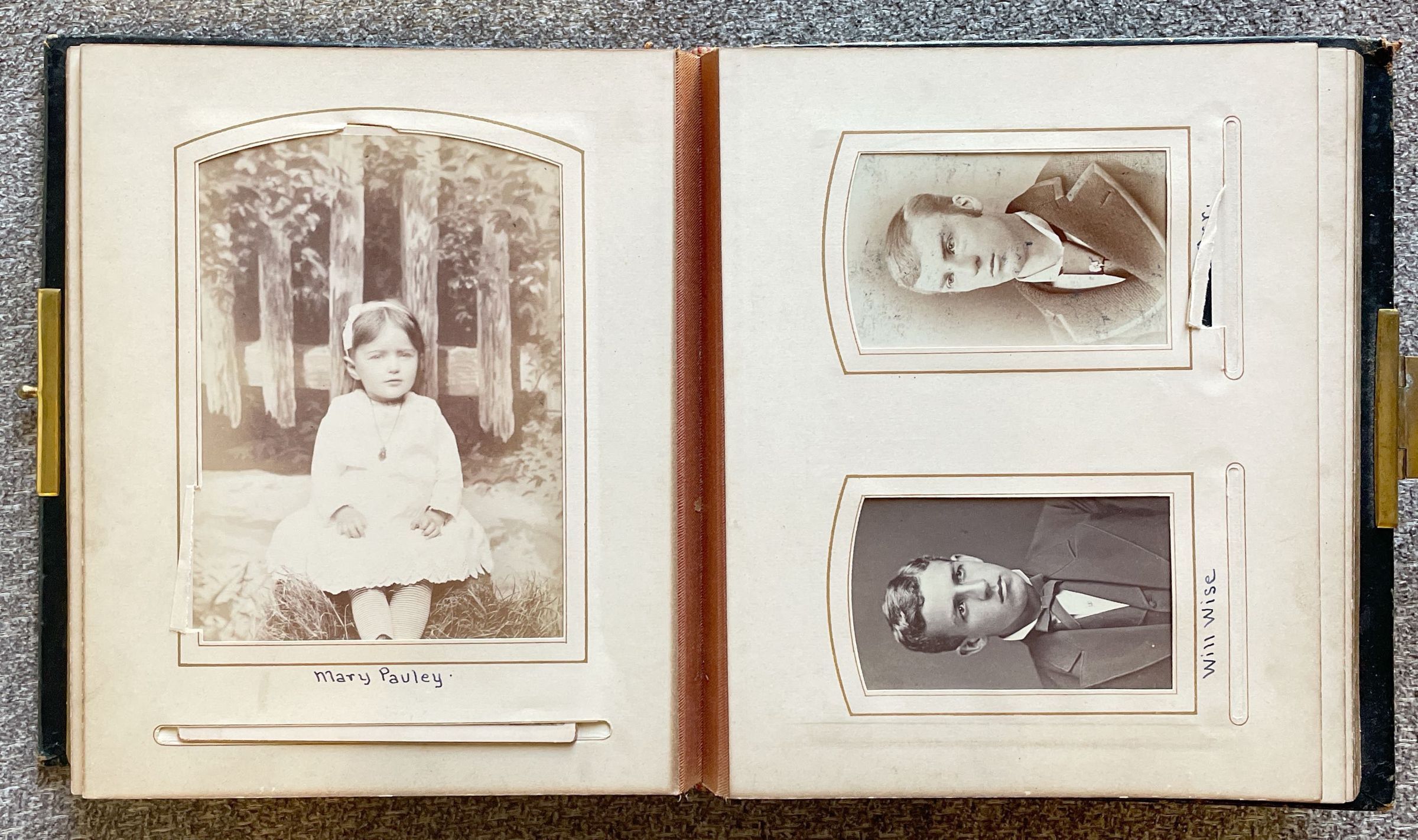 The Pauley-Thompson Album once belonged to the family of John Flenniken Pauley [1858-1929] and his wife, Margaret Virginia Thompson [1855-1937]. The album was found in a building set for demolition and was donated to the Cornerstone Genealogical Society (144 E. Greene St., PO Box 547; Waynesburg, Pennsylvania 15370). Shared with the Greene Connections: Greene County, Pennsylvania Archives Project in 2007.