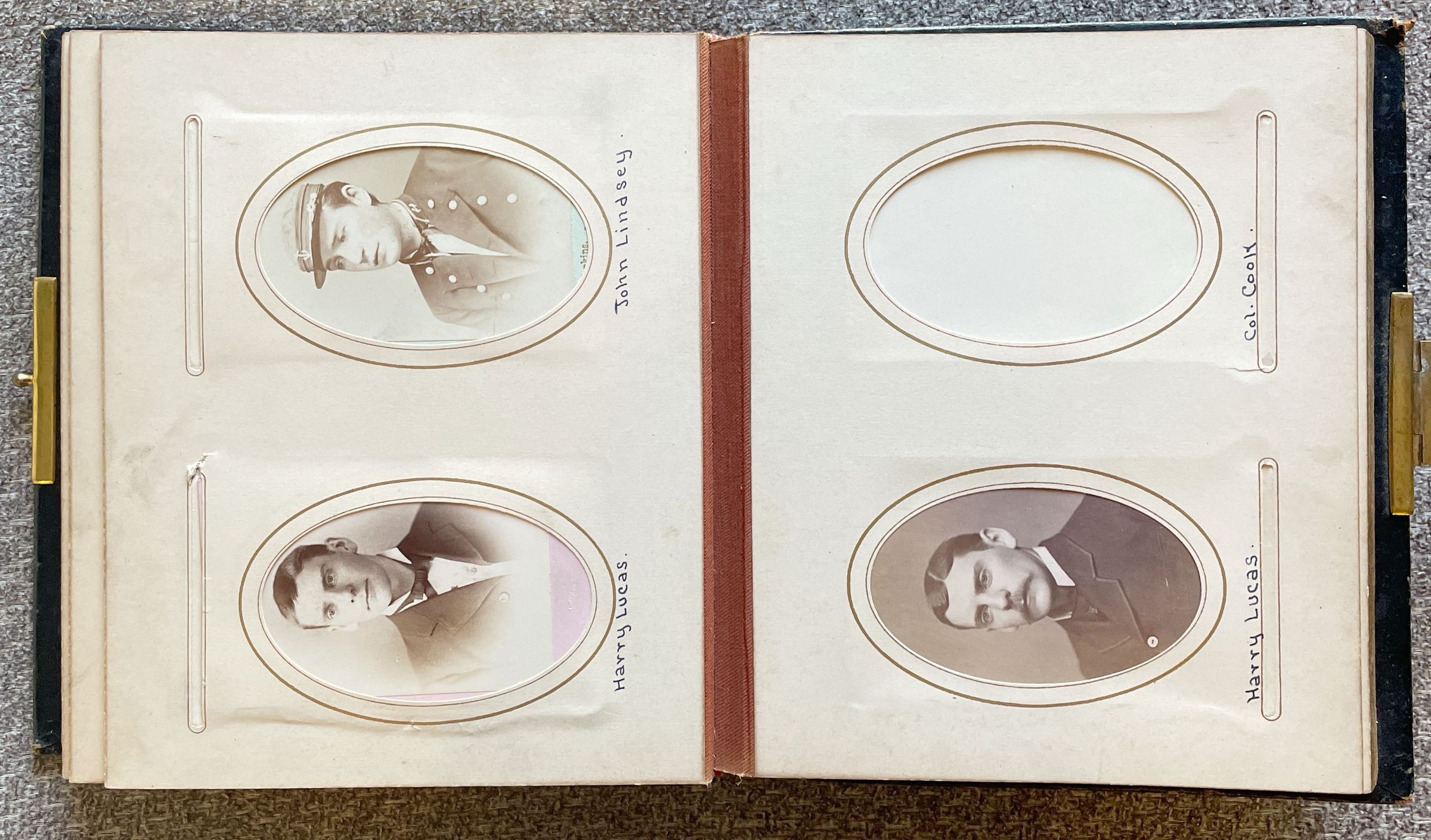 Handwritten inscription on album page reads, "Harry Lucas."
