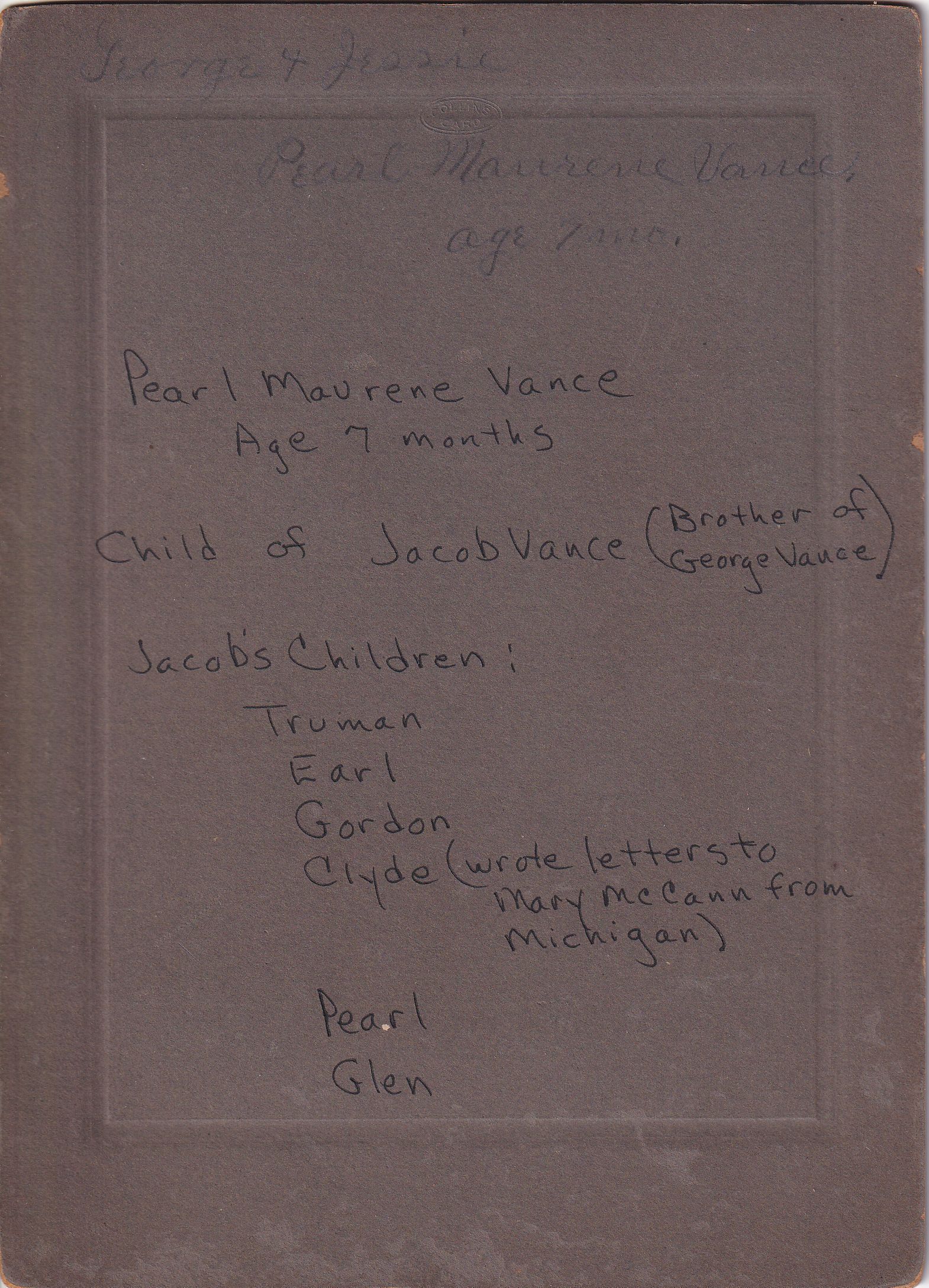 The Mary (Vance) McCann Collection was passed from George Birch Vance [1870-1928] and Jessie Dell (McFarland) Vance [1868-1935] with the ownership of their home in Mapletown, Monongahela Township, Greene County, Pennsylvania, to their daughter, Mary (Vance) McCann [1898-1987], and her husband, Marshall Albert McCann [1895-1956]. Mary (Vance) McCann left the collection to her grandson, William Marshall Miller, who owned and shared the collection with the Greene Connections: Greene County, Pennsylvania Archives Project in 2023.