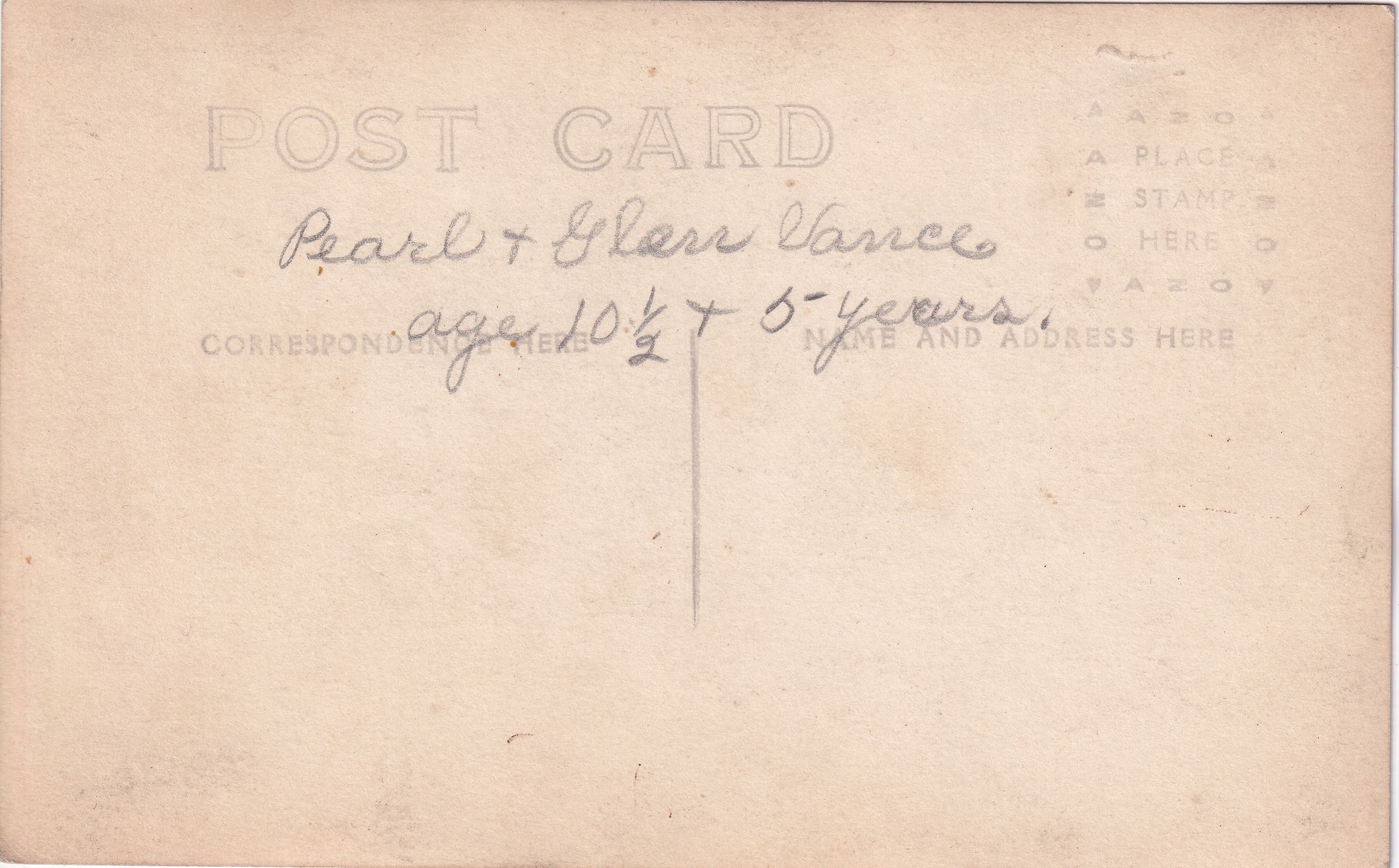 SOURCE CITATION: [Left-Right]: Pearl Maurine Vance [1907-1999] and Glenn Elmo Vance [1912-2002] - children of Jacob Vance and Minnie King; circa 1917-1918; item no. MILB-AN001-0006-0005, Vance Series, Mary (Vance) McCann Collection, shared by her grandson, William Marshall Miller; Greene Connections Archives Project (www.GreeneConnections.com).