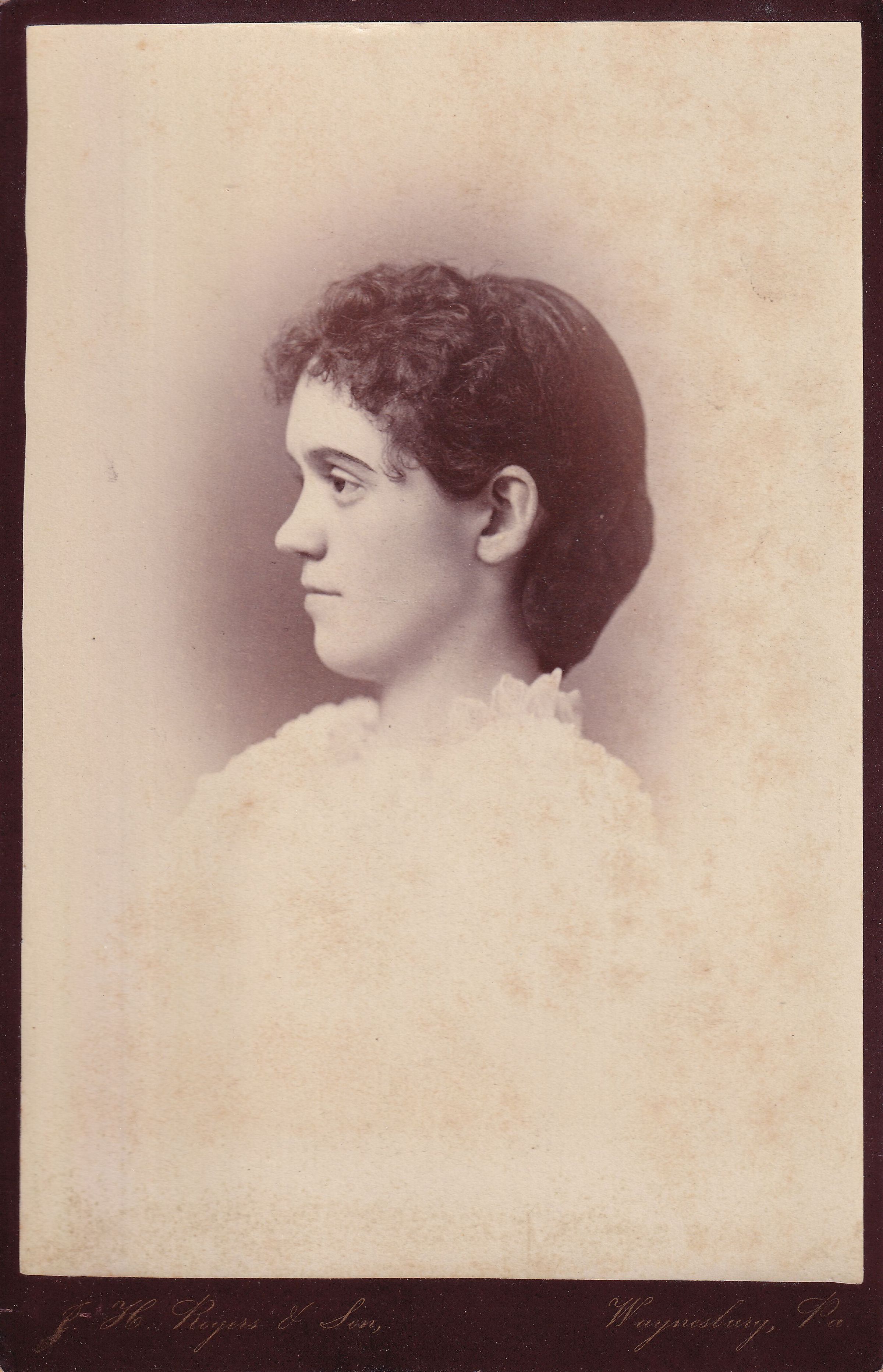 SOURCE CITATION: Phelan-Walker Album, Photo 10 - Rachel Emily "Emma" (Rinehart) Lucas [1861-1951]; circa 1880-1890, image by J. H. Rogers & Son, Waynesburg, Pa.; item no. WAYN-AN008-0010, Waynesburg University Paul R. Stewart Museum Collection, Greene Connections Archives Project (www.GreeneConnections.com).