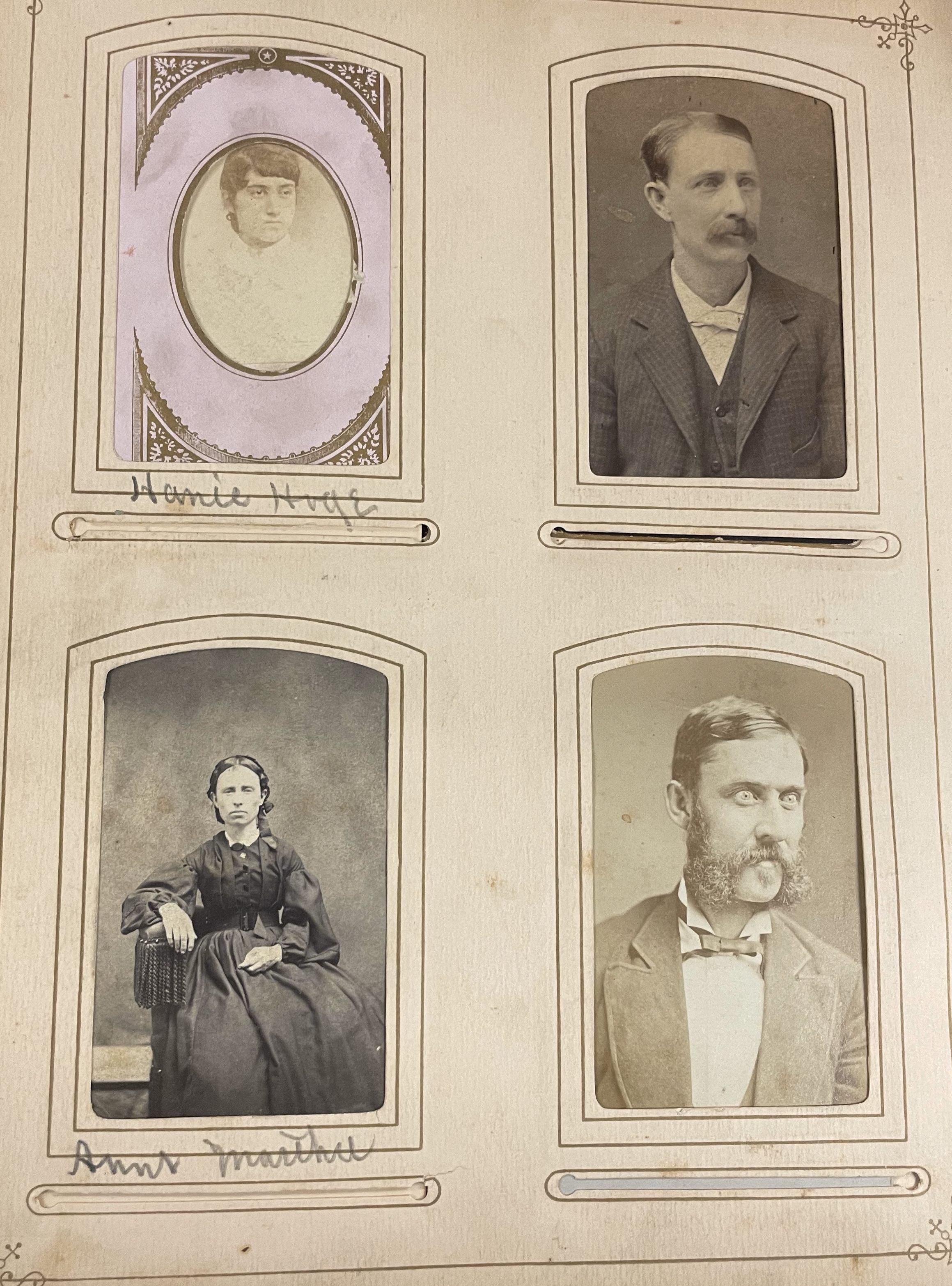 Mary (Phelan) Hogue [1846-1934] was the daughter of John Phelan [1806-1874] and Jane (Walker) Phelan [1808-1876]. Mary's husband was Asa Brownfield Hogue [1841-1915], son of Solomon Hoge [1803-1877] and Rachel Huss [1811-1890]. Relatives of both families are represented in the album, as well as other individuals from their community and acquaintance. Notable among the images are Mary's brother John Phelan [1846-1870] and his shipmate Thomas Logan Tulloch [1845-1870], both of whom were lost at sea, off the coast of Yokohama, Japan, with the U.S.S. Oneida on 24 January 1870.