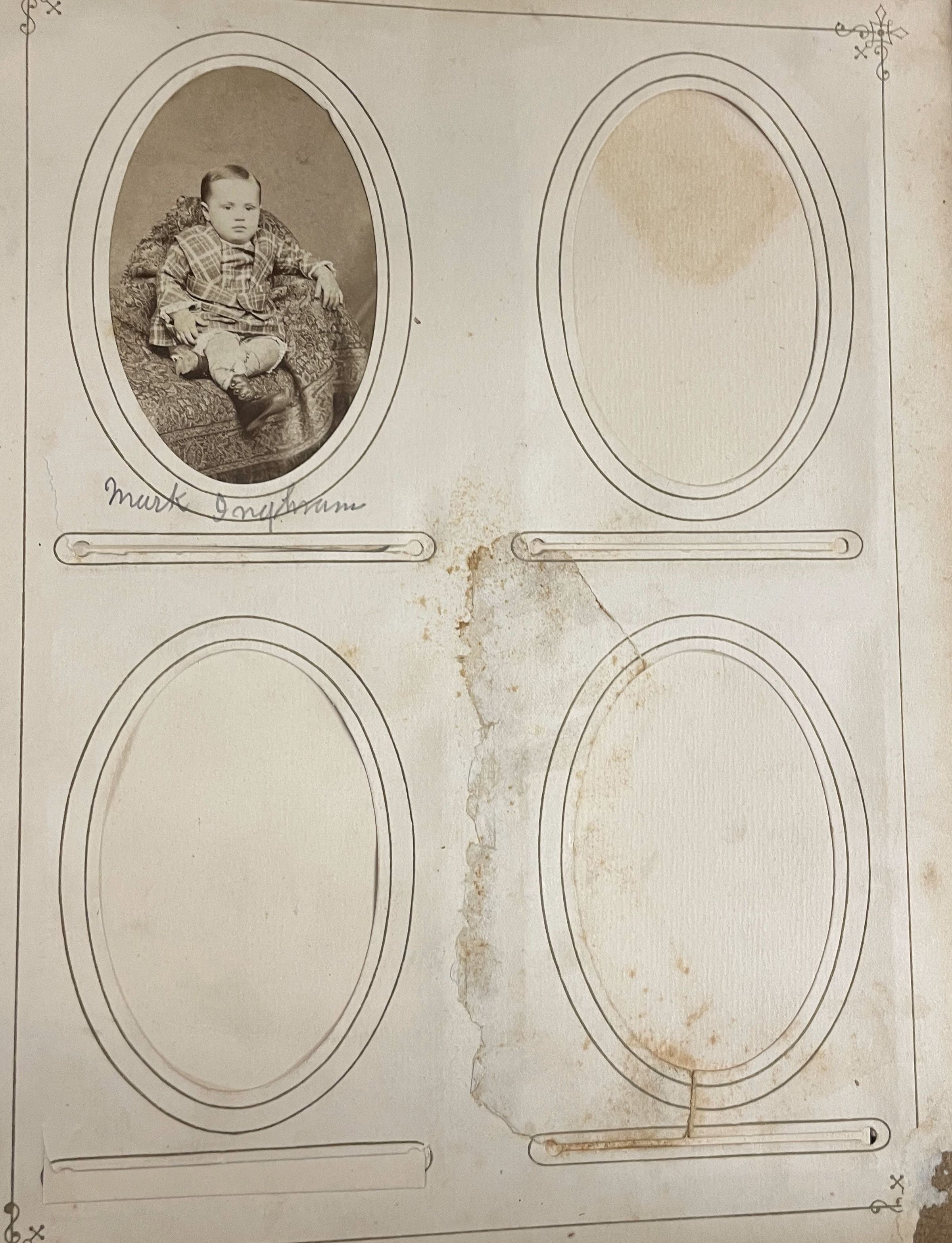 Mary (Phelan) Hogue [1846-1934] was the daughter of John Phelan [1806-1874] and Jane (Walker) Phelan [1808-1876]. Mary's husband was Asa Brownfield Hogue [1841-1915], son of Solomon Hoge [1803-1877] and Rachel Huss [1811-1890]. Relatives of both families are represented in the album, as well as other individuals from their community and acquaintance. Notable among the images are Mary's brother John Phelan [1846-1870] and his shipmate Thomas Logan Tulloch [1845-1870], both of whom were lost at sea, off the coast of Yokohama, Japan, with the U.S.S. Oneida on 24 January 1870.