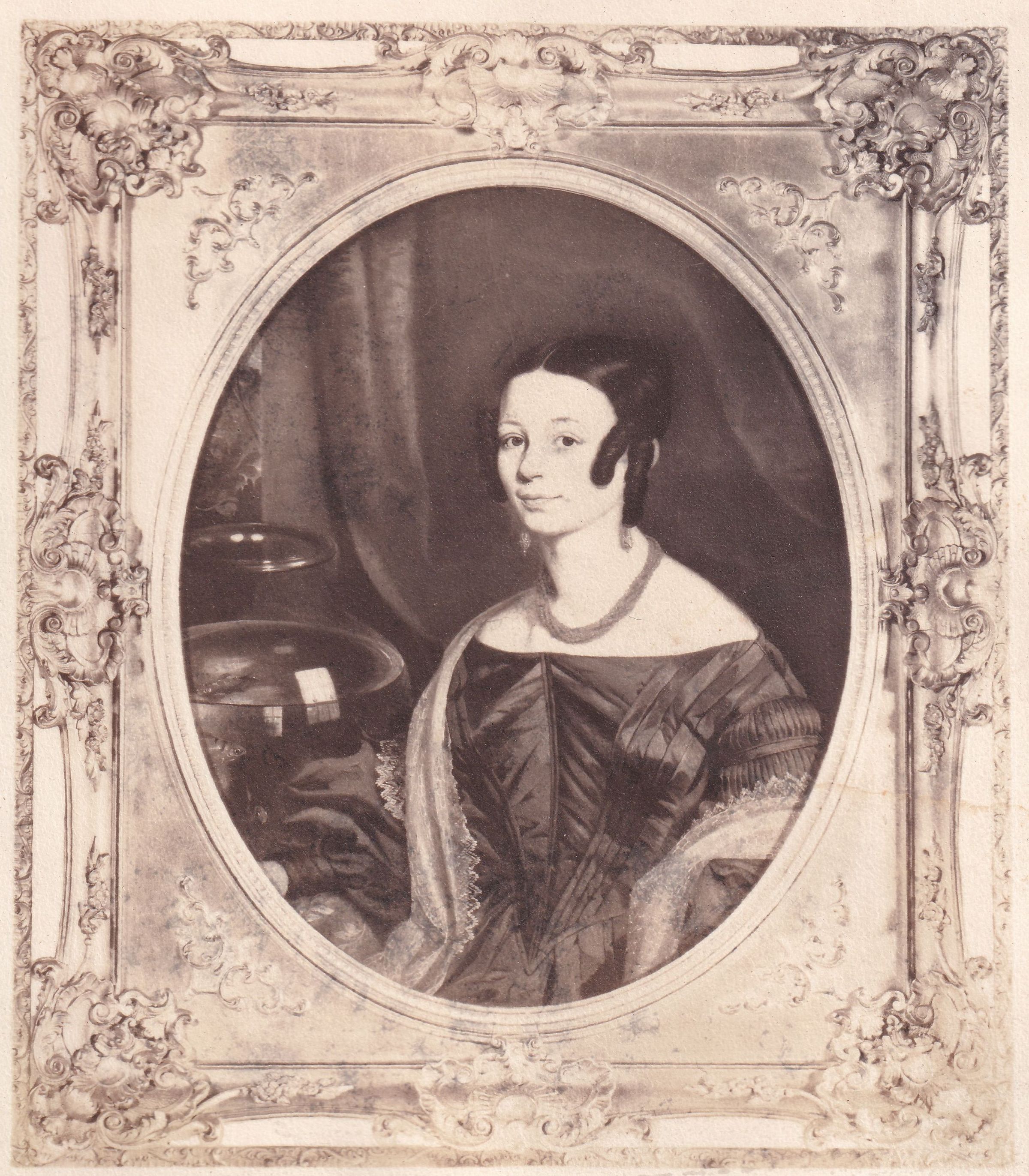 Dated 1832. Photograph of a painted portrait depicting Phoebe (Terrell) Edmonds [1813-1897] - wife of William Edmonds, daughter of Thomas Terrell. Phoebe was the mother of Caroline Amelia Edmonds, and grandmother of Charles Arthur Weaver, who married Mary Inghram Denny, of Waynesburg, Greene County, Pennsylvania.