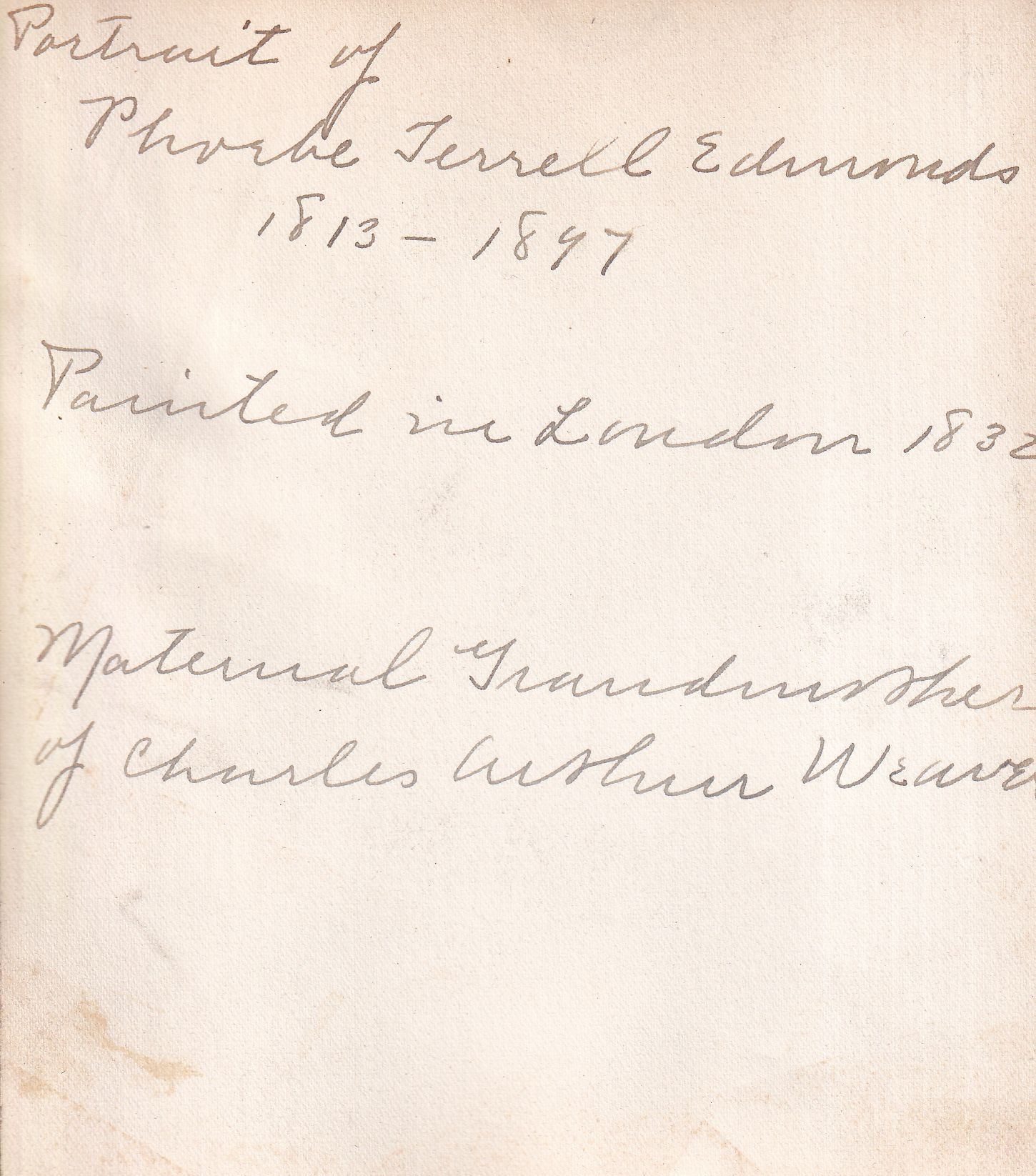 A handwritten inscription on the reverse of the image reads, "Portrait of Phoebe Terrell Edmonds 1813-1897. Painted in London 1832. Maternal grandmother of Charles Arthur Weaver."Collection
