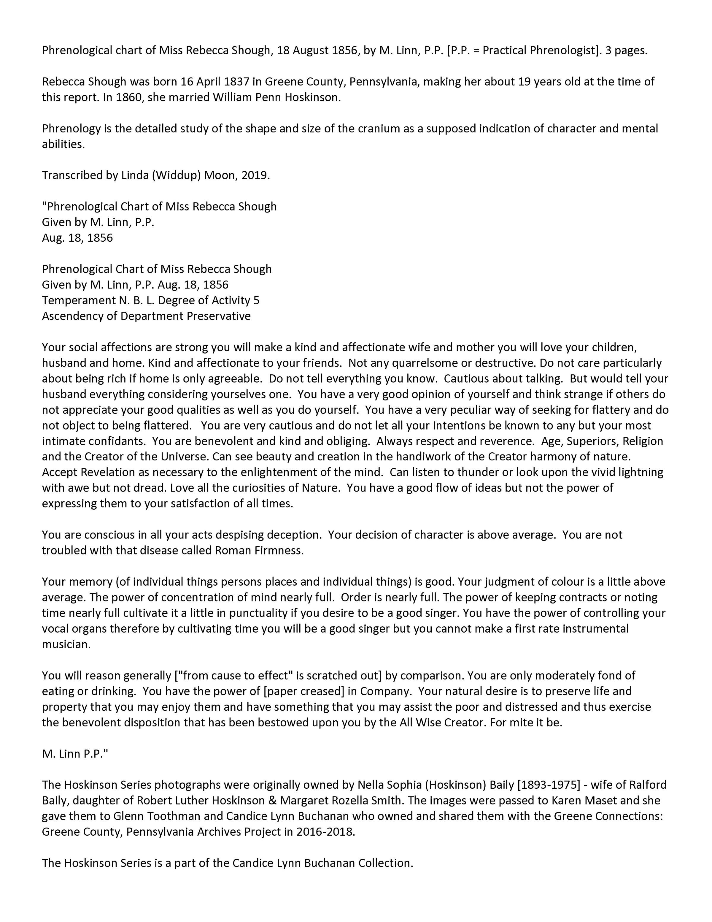 Source Citation: Phrenological chart of Miss Rebecca Shough, 18 August 1856, by M. Linn, P.P. [P.P. = Practical Phrenologist], item no. CAND-AN011-0002-0000, Hoskinson Series donated by Karen Maset, Candice Lynn Buchanan Collection, Greene Connections Archives Project (www.GreeneConnections.com).