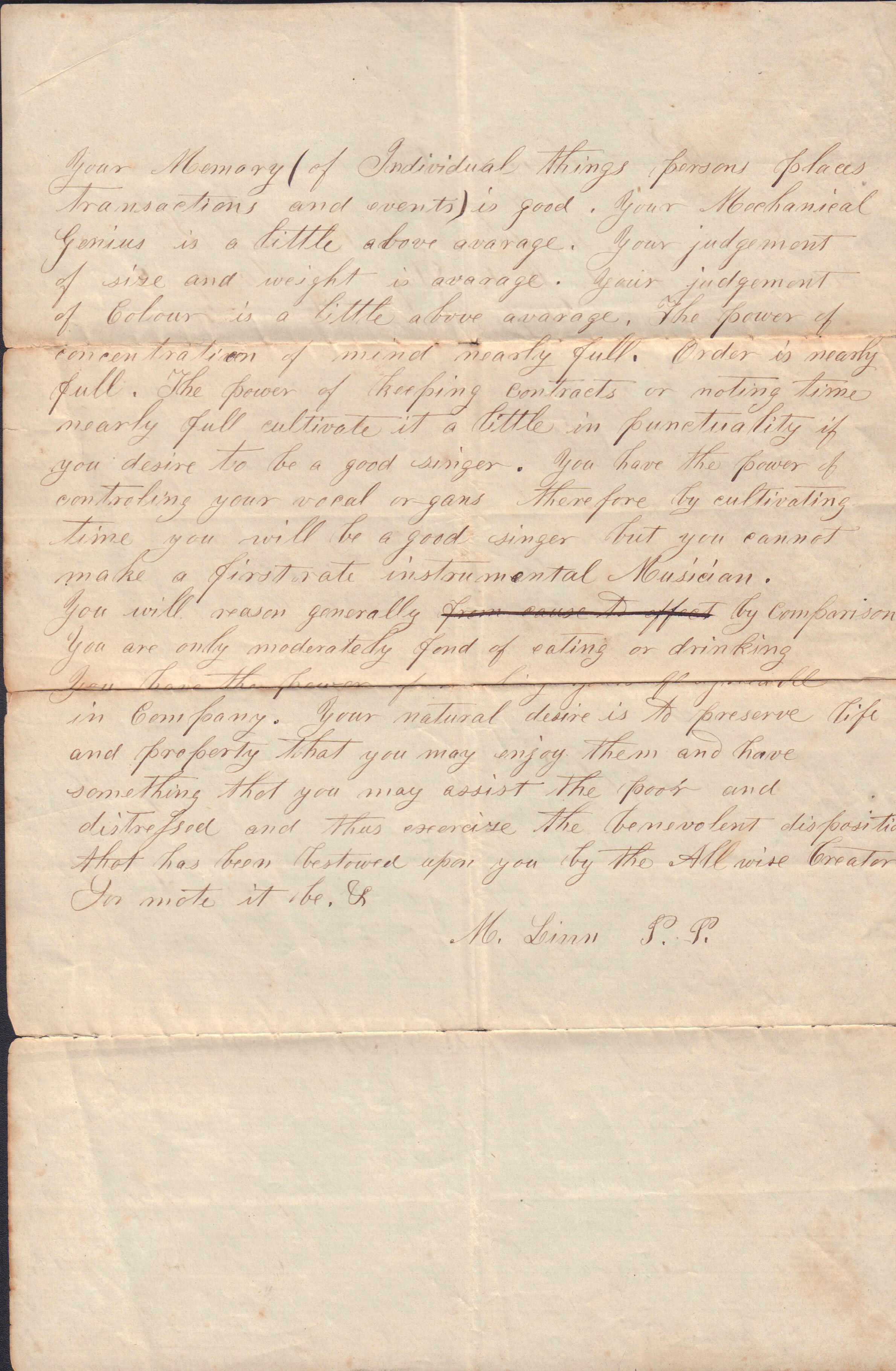 You will reason generally ["from cause to effect" is scratched out] by comparison. You are only moderately fond of eating or drinking. You have the power of [paper creased] in Company. Your natural desire is to preserve life and property that you may enjoy them and have something that you may assist the poor and distressed and thus exercise the benevolent disposition that has been bestowed upon you by the All Wise Creator. For mite it be.