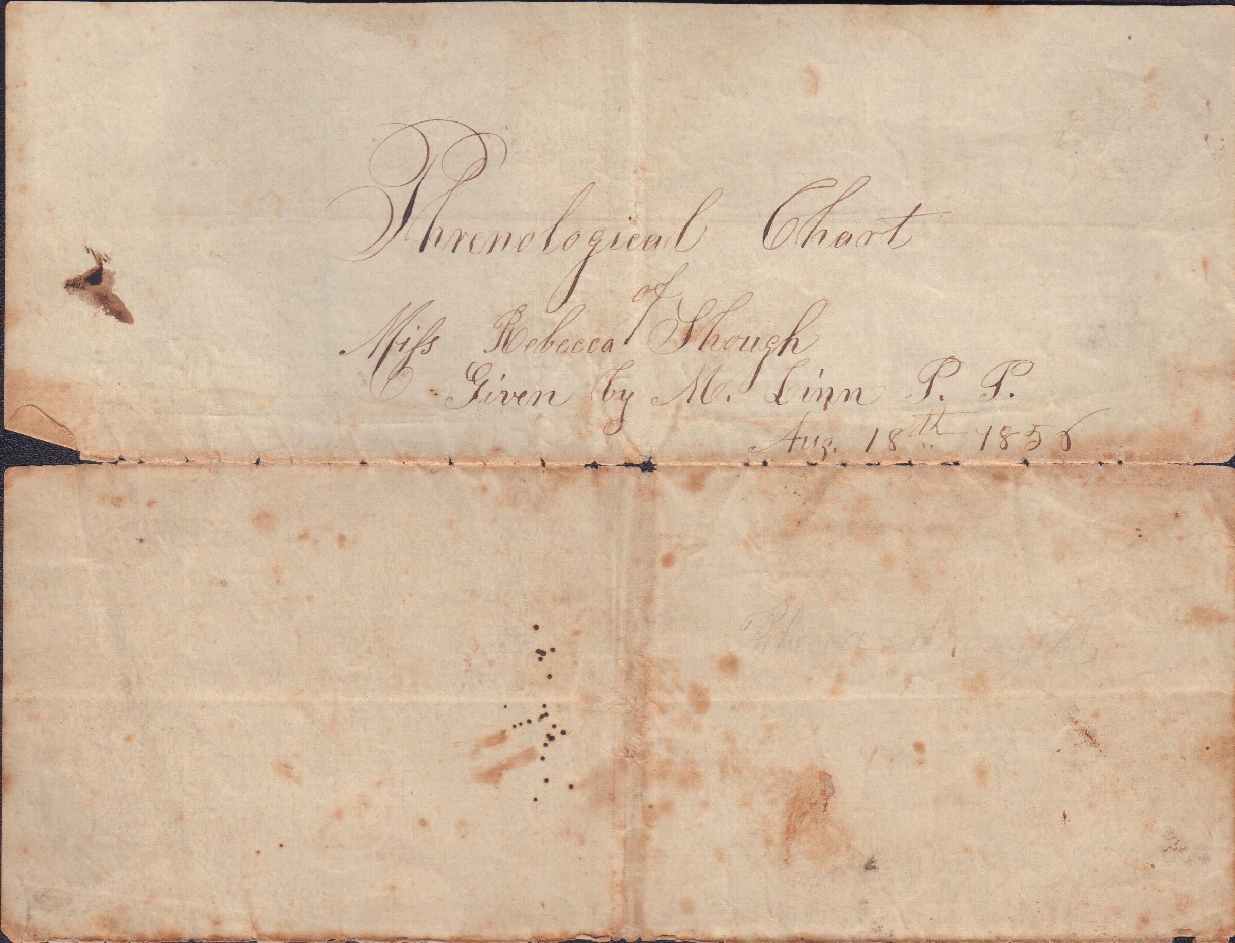 Phrenological chart of Miss Rebecca Shough, 18 August 1856, by M. Linn, P.P. [P.P. = Practical Phrenologist]. 3 pages.