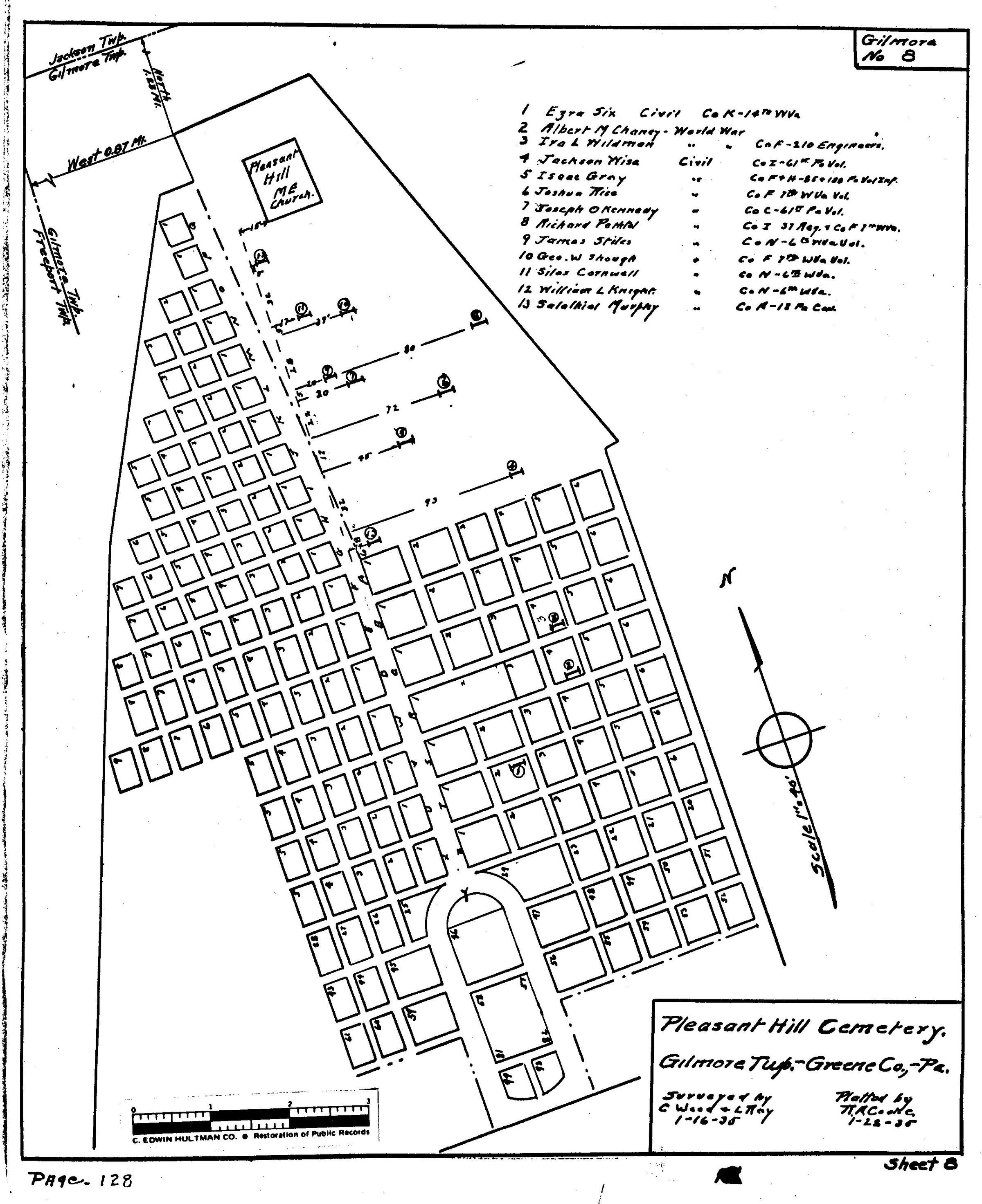 SOURCE CITATION: WPA Cemetery Plat - Pennsylvania - Greene County - Gilmore Township - Pleasant Hill Cemetery (1935), item no. 2016.3.208, Cemetery Plat (WPA) Collection, surveyed by Works Projects Administration, copy on file at the Clerk of Courts Office, Greene County Courthouse, Greene Connections Archives Project (GreeneConnections.com).