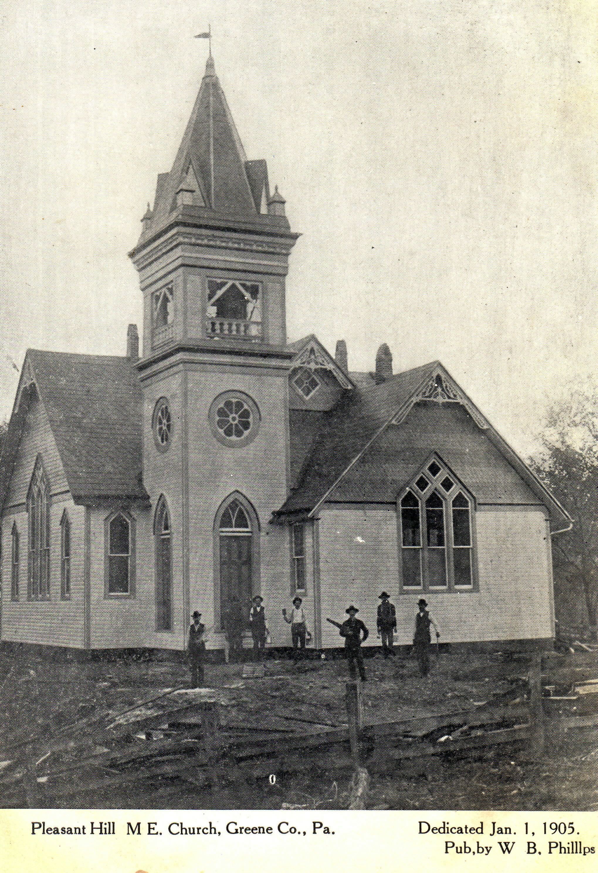 SOURCE CITATION: Real-photo postcard of the Pleasant Hill Methodist Episcopal Church in Gilmore Township, Greene County, Pennsylvania; circa 1905, printed by W. B. Phillips; item no. RUSH-AN001-0005-0001, Walter Markiewich Postcard Collection, shared by Brice and Linda Rush; Greene Connections Archives Project (GreeneConnections.com).