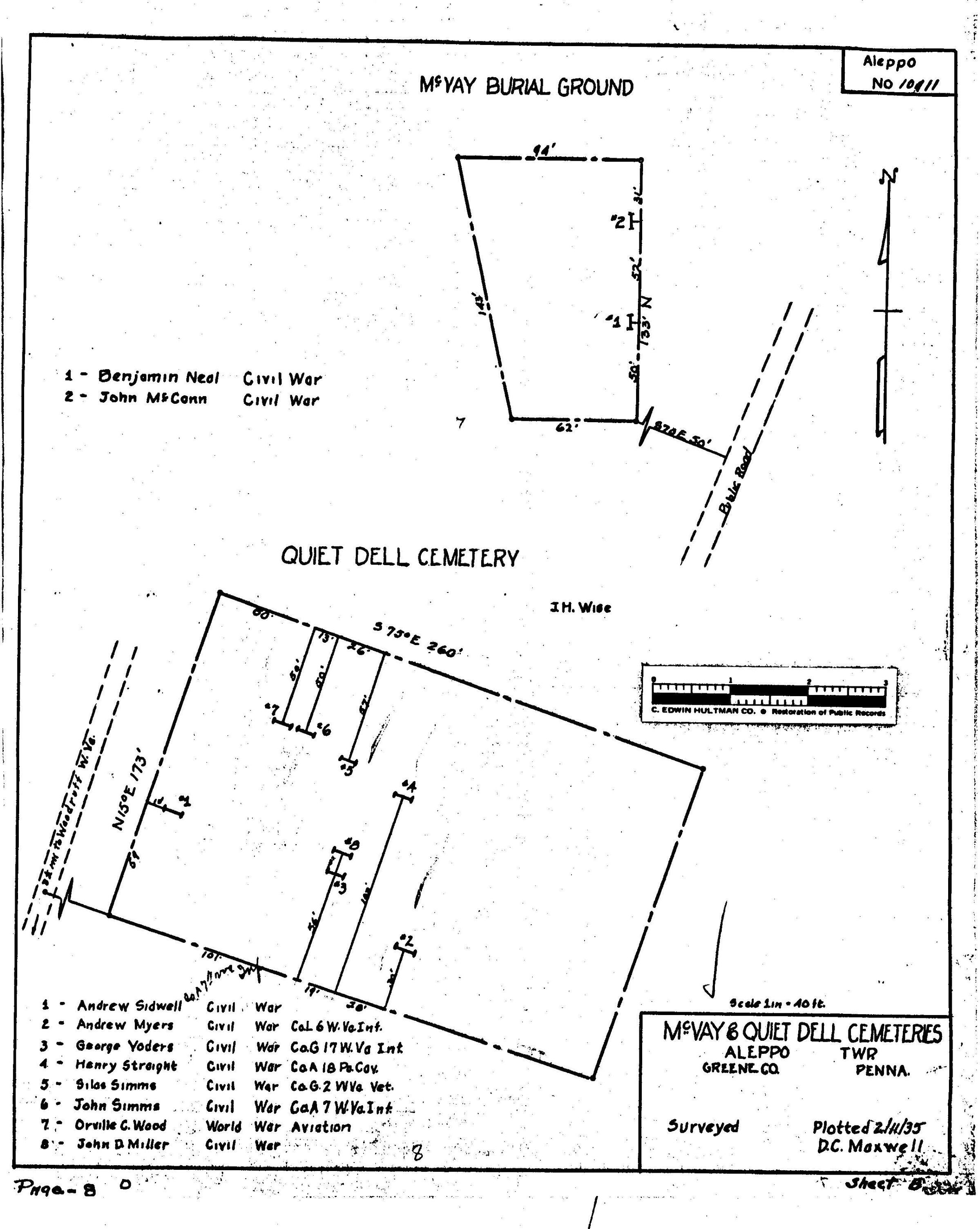 Source Citation: WPA Cemetery Plat - Pennsylvania - Greene County - Aleppo Township - Quiet Dell Cemetery (1935), item no. 2016.3.9, Cemetery Plat (WPA) Collection, surveyed by Works Projects Administration, copy on file at the Clerk of Courts Office, Greene County Courthouse, Greene Connections Archives Project (www.GreeneConnections.com).