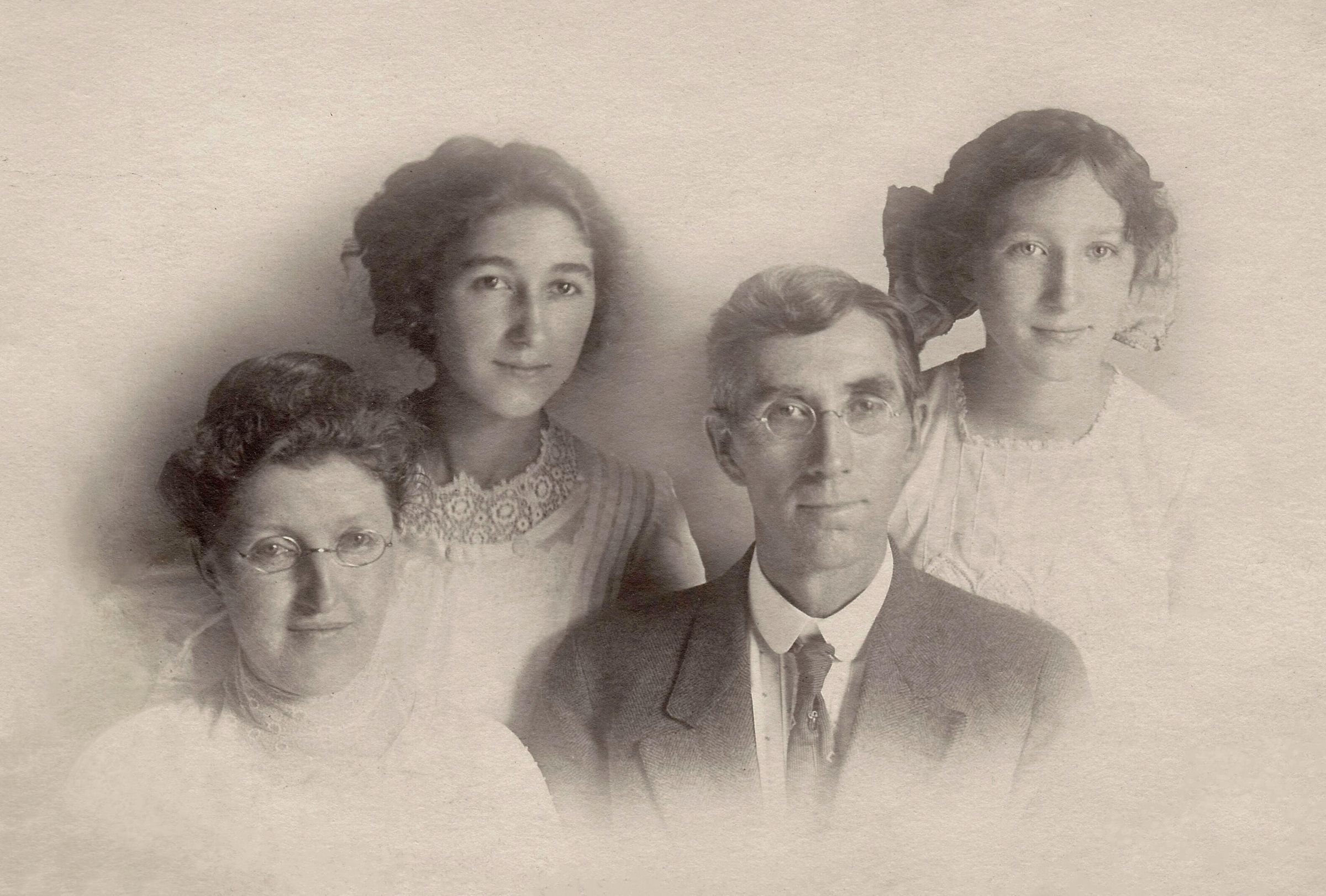 Rev. James Madison Morris [1866-1947] with his wife, Minnie Lou (Smith) Morris, and daughters Hazel Morris and Lois Morris.