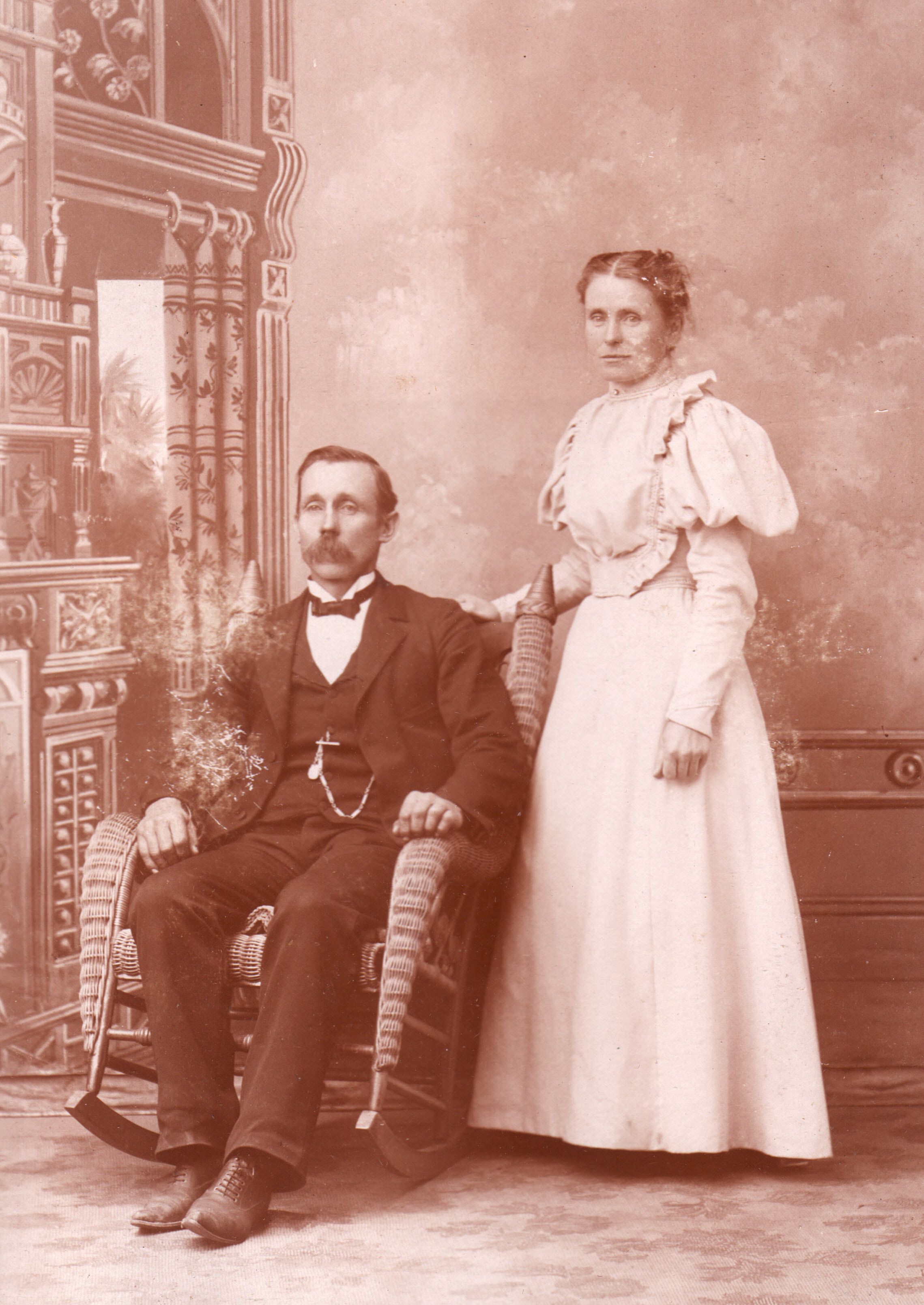 SOURCE CITATION: Rice-Fordyce Album 01, Photo 23 - John Lindsey Main and his third wife, Katherine Jane (Kimble) Main, on their wedding day 1 August 1897; image by Sayers, Waynesburg, Pa.; item no. RICE-AN001-0001-0023, John Robert Rice Collection, Greene Connections Archives Project (www.GreeneConnections.com).