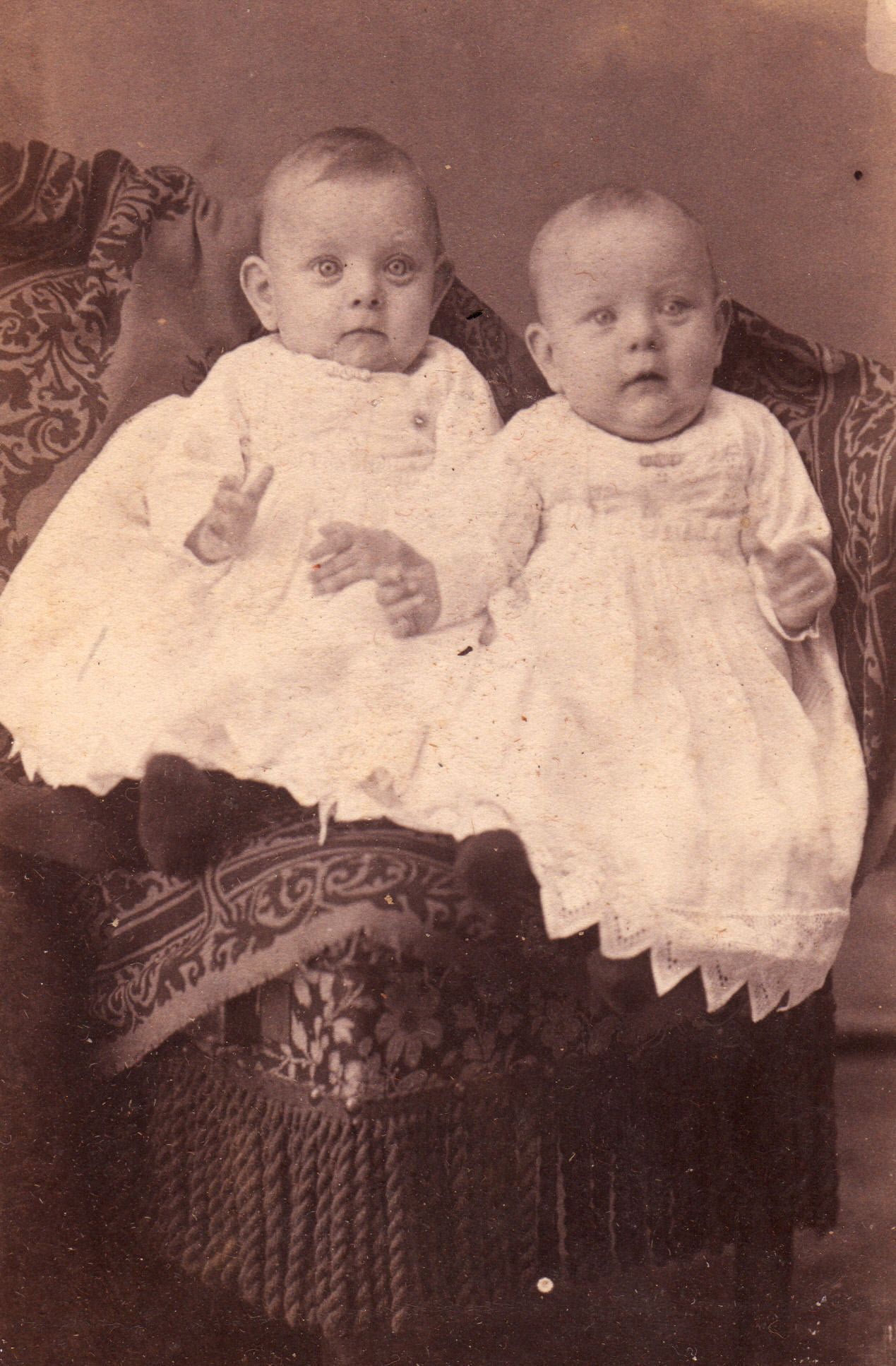 SOURCE CITATION: Rice-Fordyce Album 02, Photo 01 - [Left-Right]: Lynn R. Conner, Lee F. Conner - twin sons of Charles W. Conner, born 14 March 1886; circa 1886-1887, image by J. M. Simington, Memphis, Mo.; item no. RICE-AN001-0002-0001, John Robert Rice Collection, Greene Connections Archives Project (www.GreeneConnections.com).