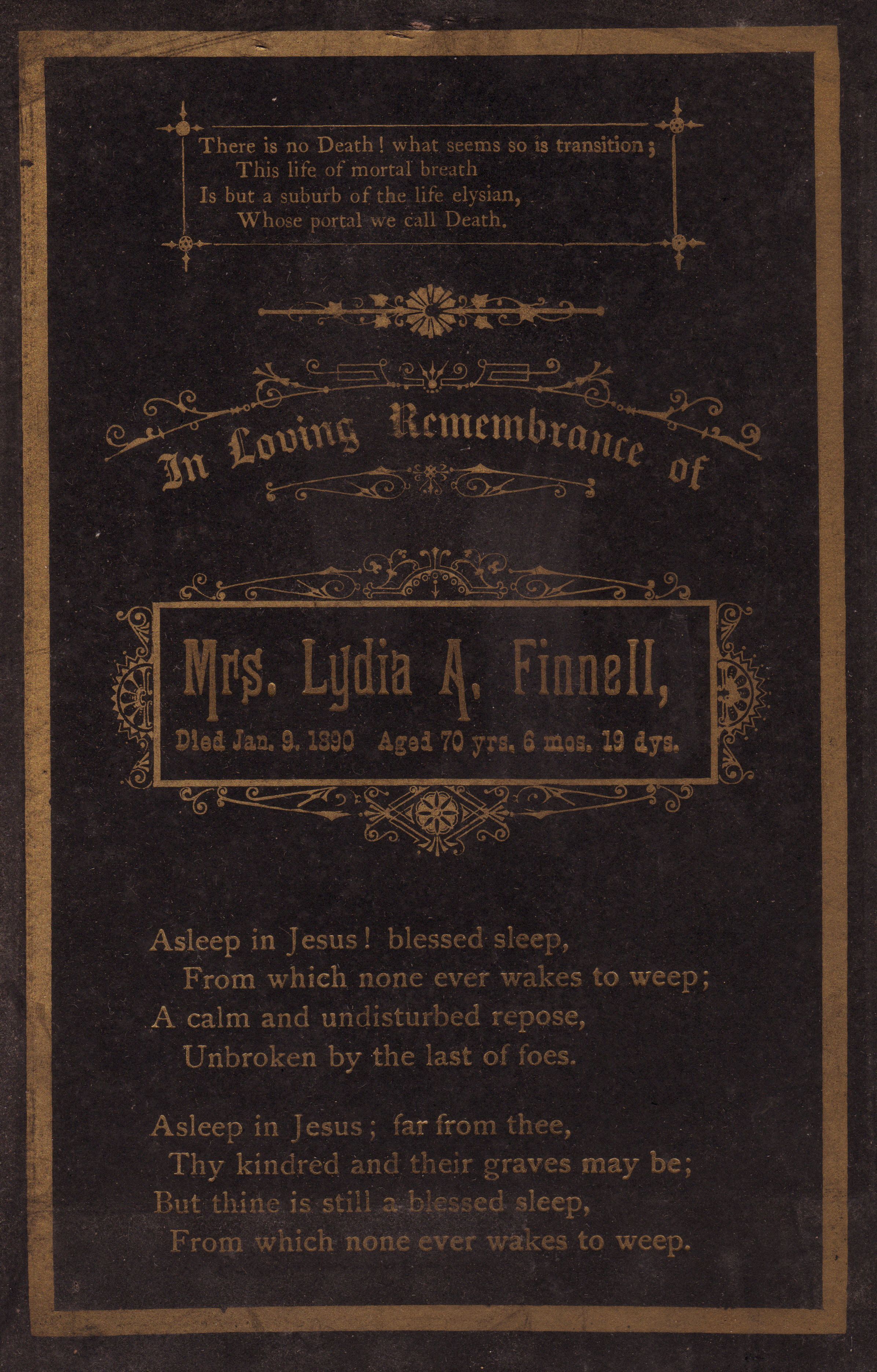 SOURCE CITATION: Rice-Fordyce Album 02, Photo 18 - Funeral card of Lydia Anne (Bodley) Finnell [1819-1890]; item no. RICE-AN001-0002-0018, John Robert Rice Collection, Greene Connections Archives Project (www.GreeneConnections.com).
