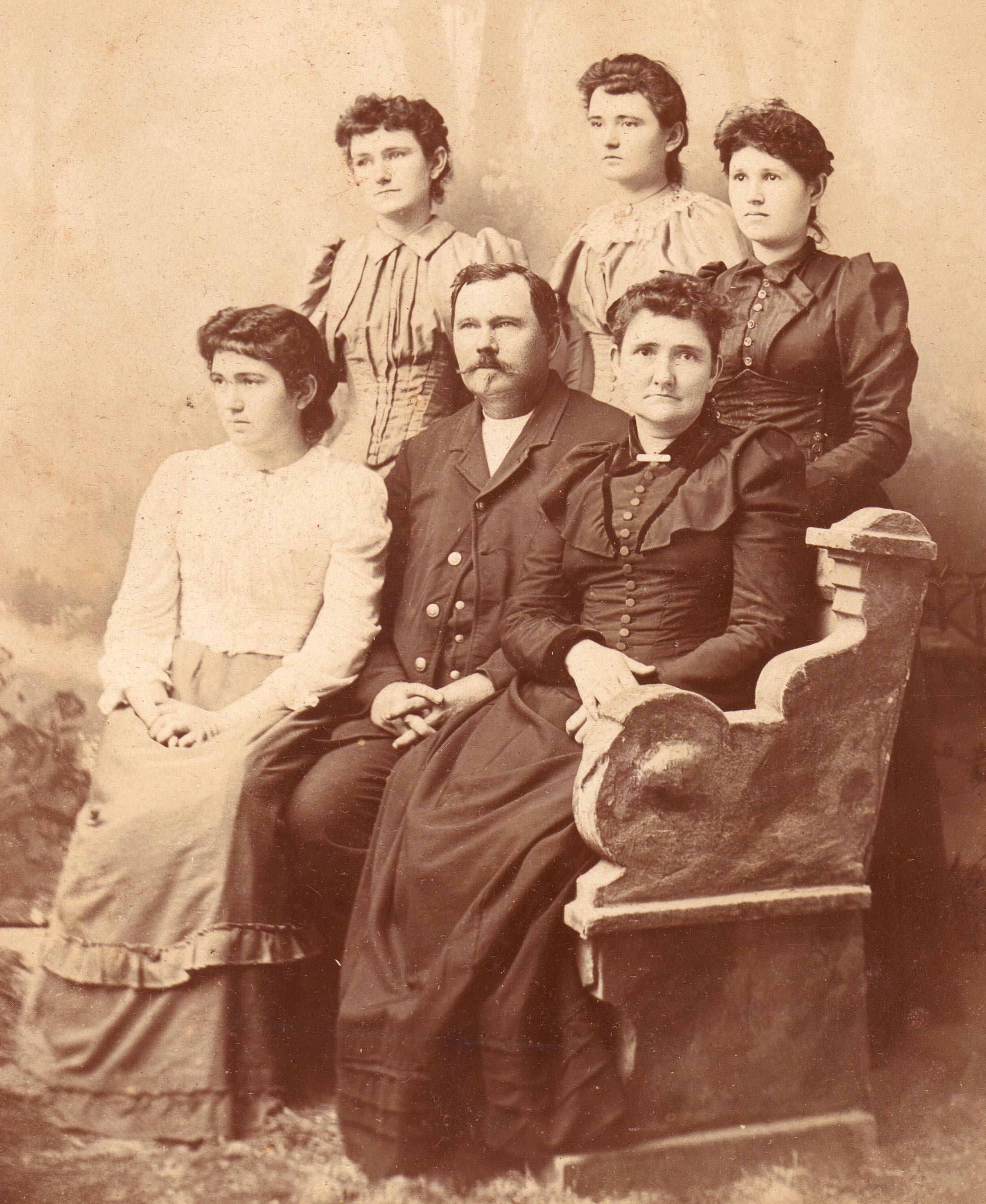 SOURCE CITATION: Rice-Fordyce Album 02, Photo 23 - Owen Thomas Wright and his wife Julia (O'Donald) Wright, with their four daughters; circa 1880-1900, image by Browner, Cottage Studio, Garden City, Kas.; item no. RICE-AN001-0002-0023, John Robert Rice Collection, Greene Connections Archives Project (www.GreeneConnections.com).