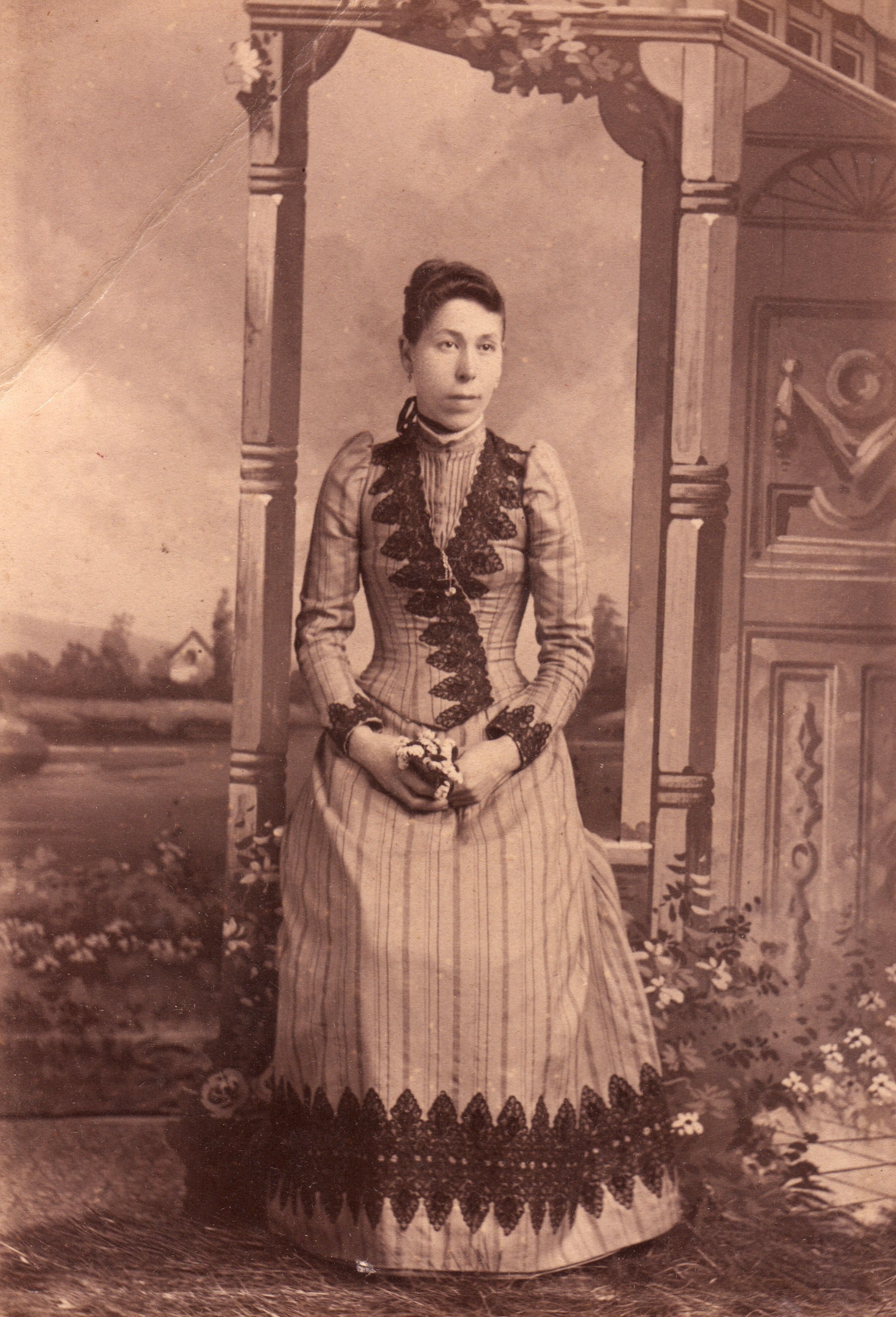 SOURCE CITATION: Rice-Fordyce Album 02, Photo 25 - Handwritten inscription indicates that this may be a photograph of either (1) Sarah Agnes (Orndoff) Smith or (2) Ella Brock; circa 1880-1900, image by Rogers, Photo, Waynesburg, Pa.; item no. RICE-AN001-0002-0025, John Robert Rice Collection, Greene Connections Archives Project (GreeneConnections.com).