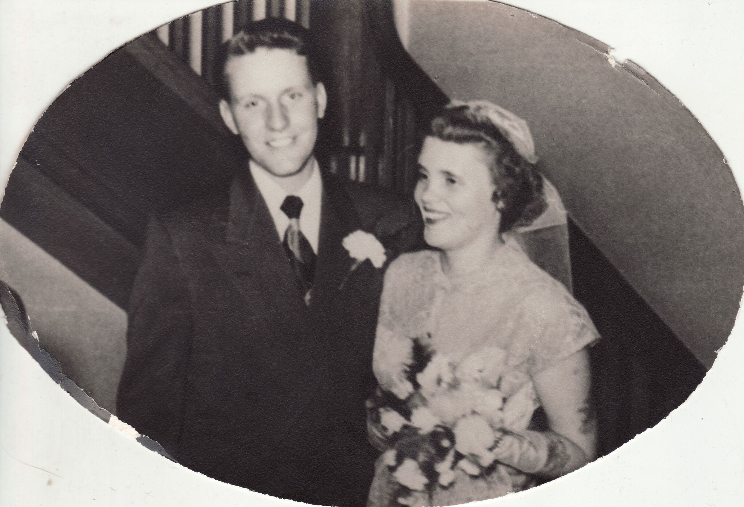 SOURCE CITATION: Robert Dewayne Whetzel [1932-2016] and his wife, Margery Ellen (Moore) Whetzel [1930-2025] on their wedding day, June 12, 1952, at the New Salem Presbyterian Church in Fayette County, Pennsylvania; item no. WHET_AN001_0003_0011, Robert Dewayne and Margery Ellen (Moore) Whetzel Collection, Greene Connections Archives Project (GreeneConnections.com).