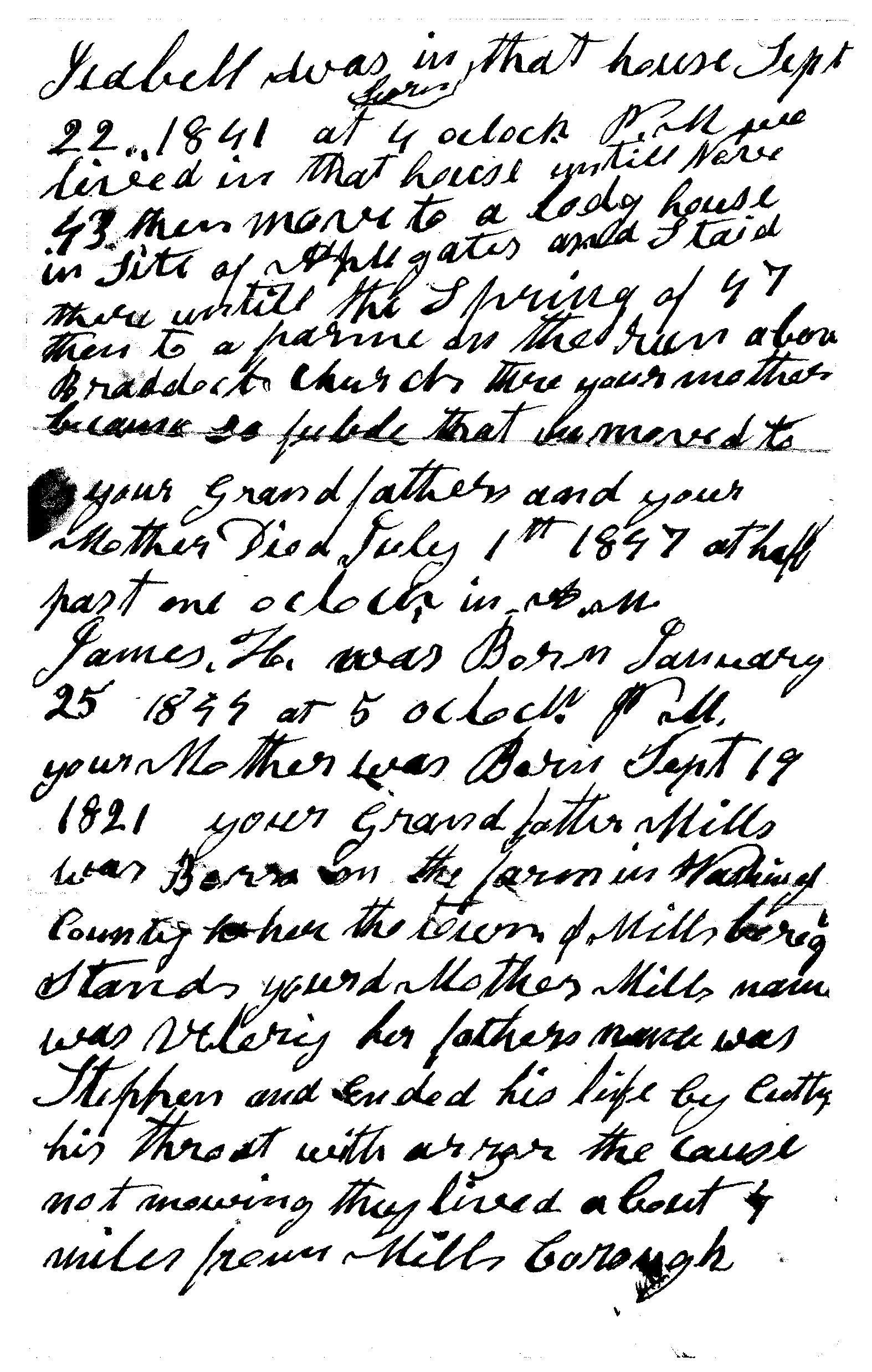 Robert Morris, (Waynesburg, Pennsylvania) to David Morris, letter, 21 January 1886; Lois (Morris) Gdovin Collection, privately held by Celia (Gdovin) Riggle, Eldon, Missouri, 2012. Transcribed by Keith Riggle. TRANSCRIPT PAGES 1-2: "Waynesburg Jan 21, 1886 I will try to answer some of your requests but there is some that I can't give much information on but will do the best I can. First I will give you a record of our ages. I was born on March the 26 1816 in Morris township Greene County 8 miles West of Waynesburg. I was bound to Robert Millikin before I was four years old in till [sic] I was 21 and served my time out. Was maried [sic] to Emaline Mills February 28 1839 and lived on David Millikin place two years and then you was born in a lodge house March the 10 1840 at 6 oclock in the P.M. In [18]41 bilt [sic] the lodg [sic] house you that you was born in moved in it in March with[out?] a door or chiny [sic] and it snowed about 4 inches deep that nite and it was a job to keep you in the house as it was rite cold. Isabell was born in that house Sept 22 1841 at 4 oclock P. M. we lived in that house untill [sic] Nov [18]43 then move to a lodg house in site of Applegates and staid [sic] there untill the Spring of [18]47 then to a farm on the run above Braddock Church. There your mother became so feeble that she moved to your grandfathers and your mother died July 1st 1847 at half past one oclock in the A.M. James H. was born January 25 1844 at 5 oclock P.M. Your mother was born Sept 19 1821. Your Grandfather Mills was born on the farm in Washington County where the town of Millsborough stands. Your Grandmother Mills name was Ulery her fathers name was Stephen and ended his life by cutting his throat with a razor the cause not nowing [sic?]. They lived about 4 miles from Millsborough."