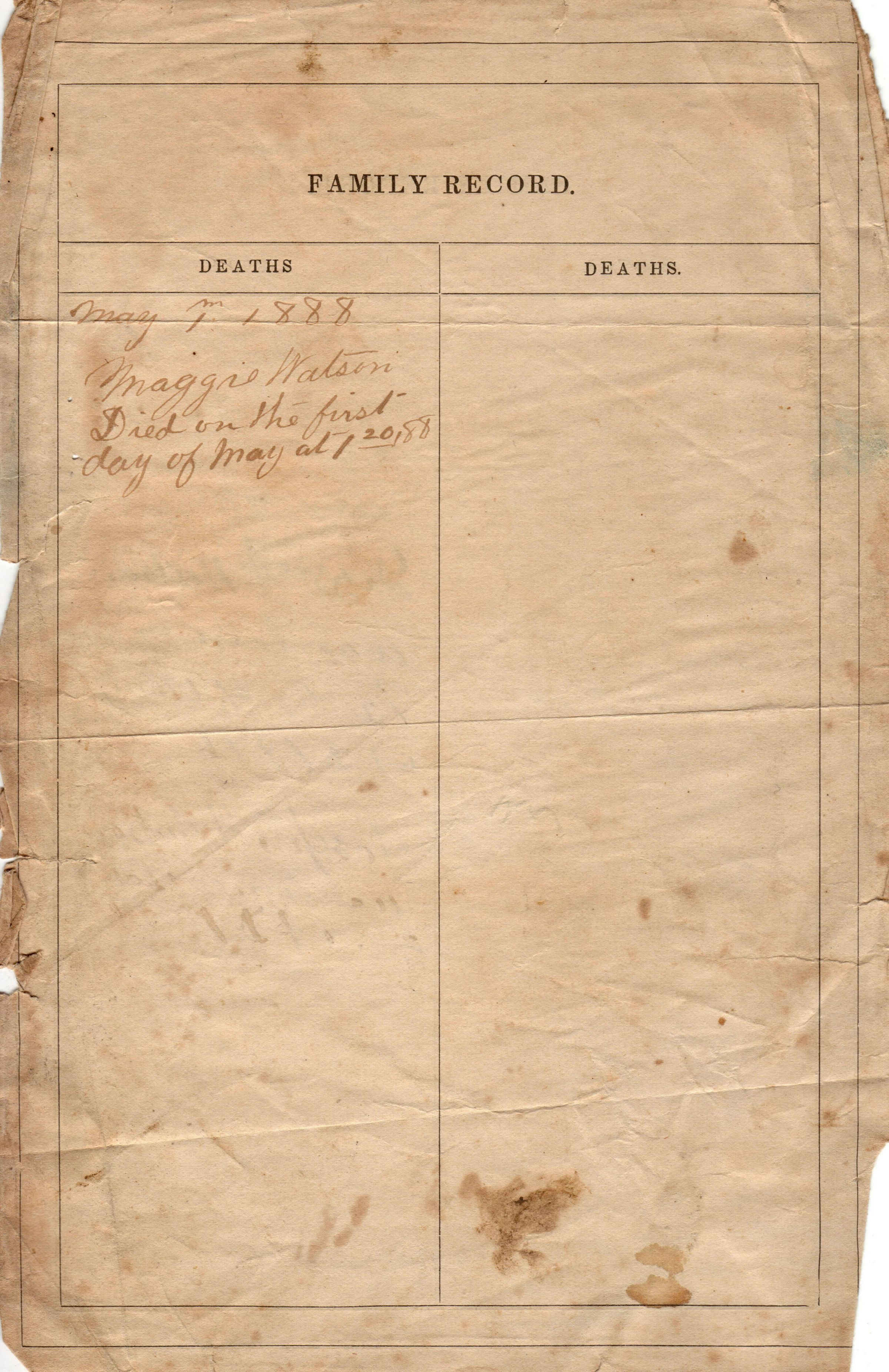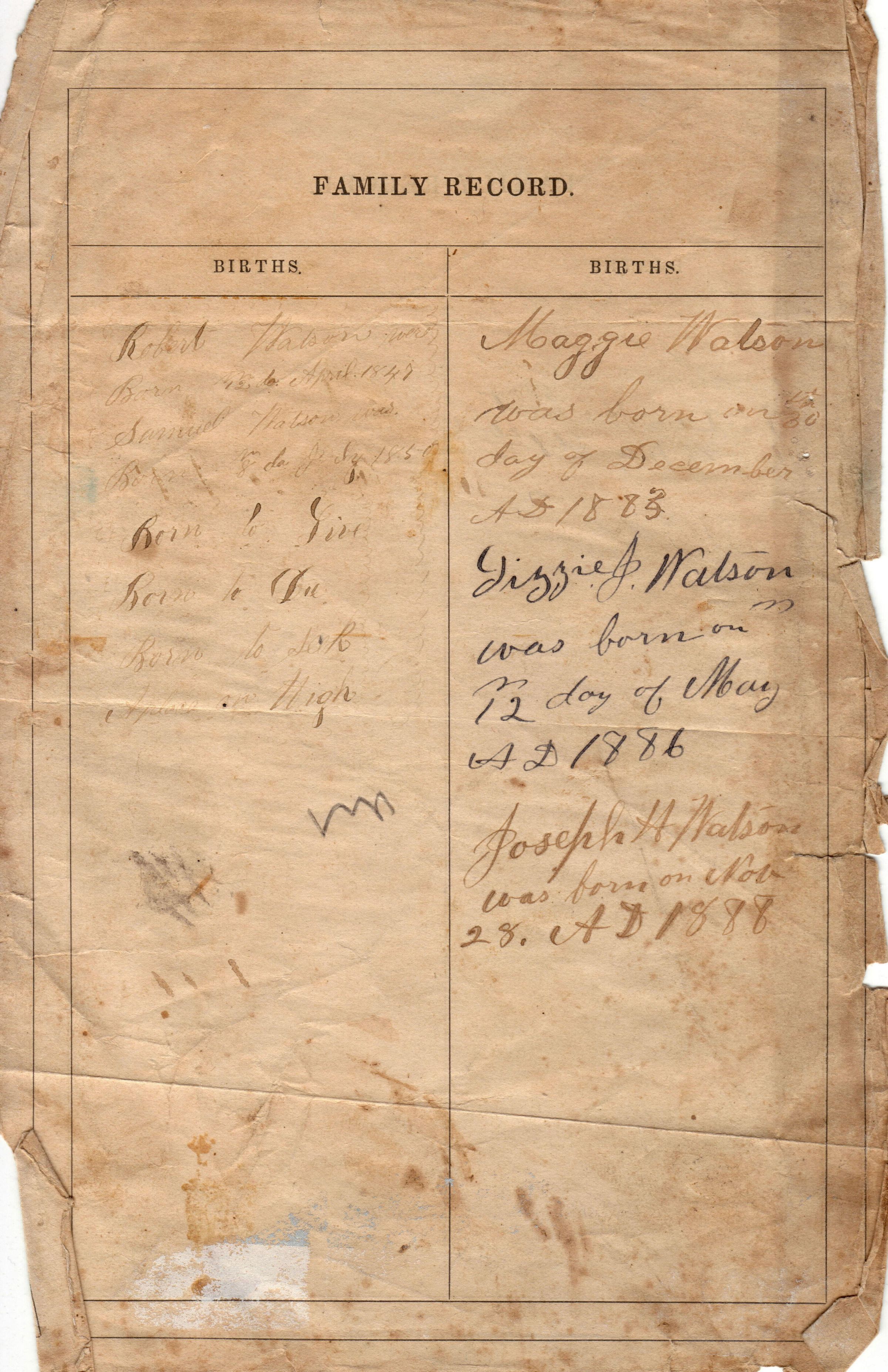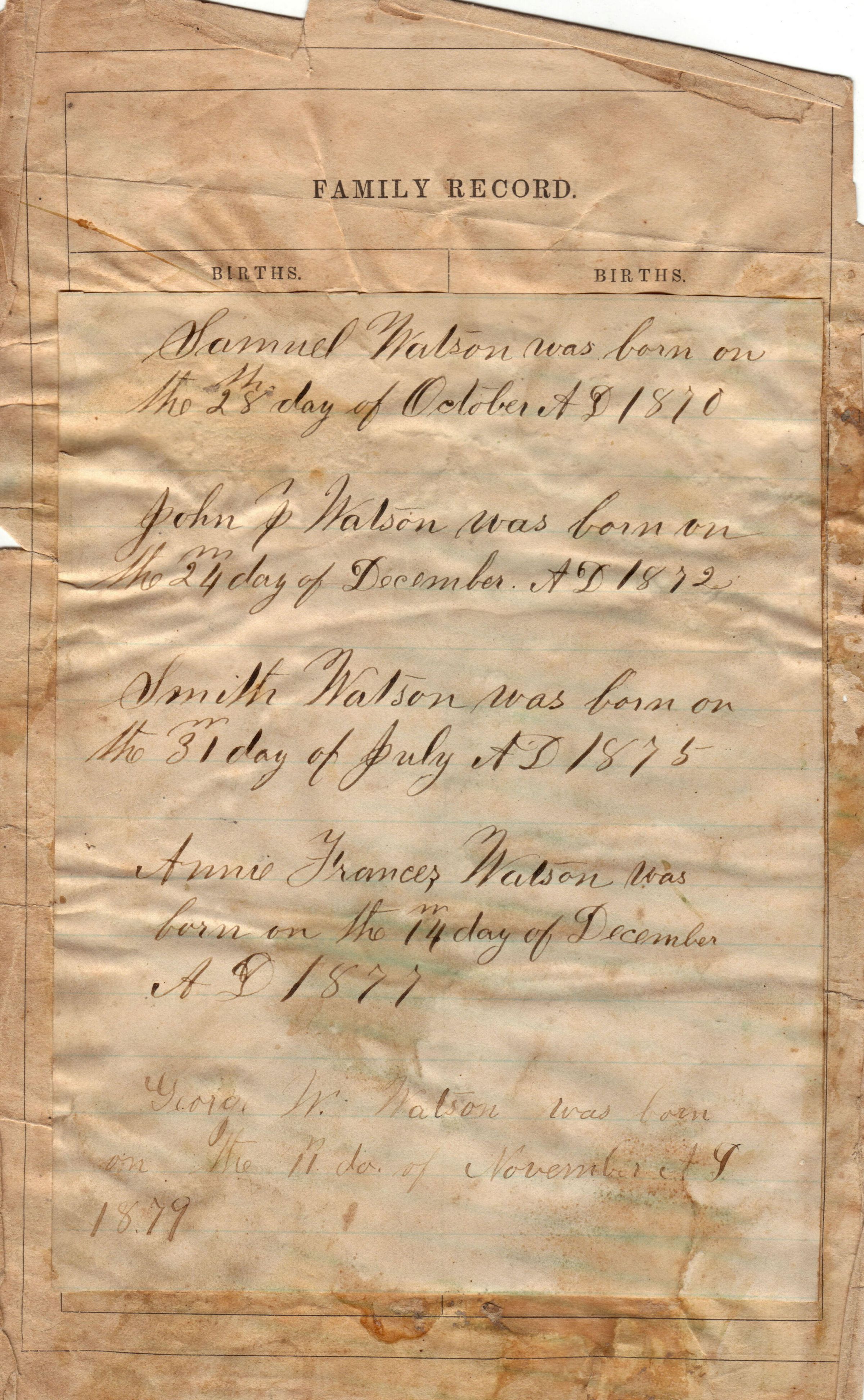 Watson, Anna Frances [1877-1932], Watson, Robert [1847-1942], Watson, Samuel (Dr.) [1850-1905], Watson, Elizabeth J. (a/k/a Lizzie) [1886-1931], Watson, Joseph Harry [1888-1981], Watson, Margaret [1883-1888], Anderson, Catharine [1848-1933], Watson, George Washington [1879-1962], Watson, John Isaac [1872-1954], Watson, Samuel S., Watson, Smith [1875-1922]