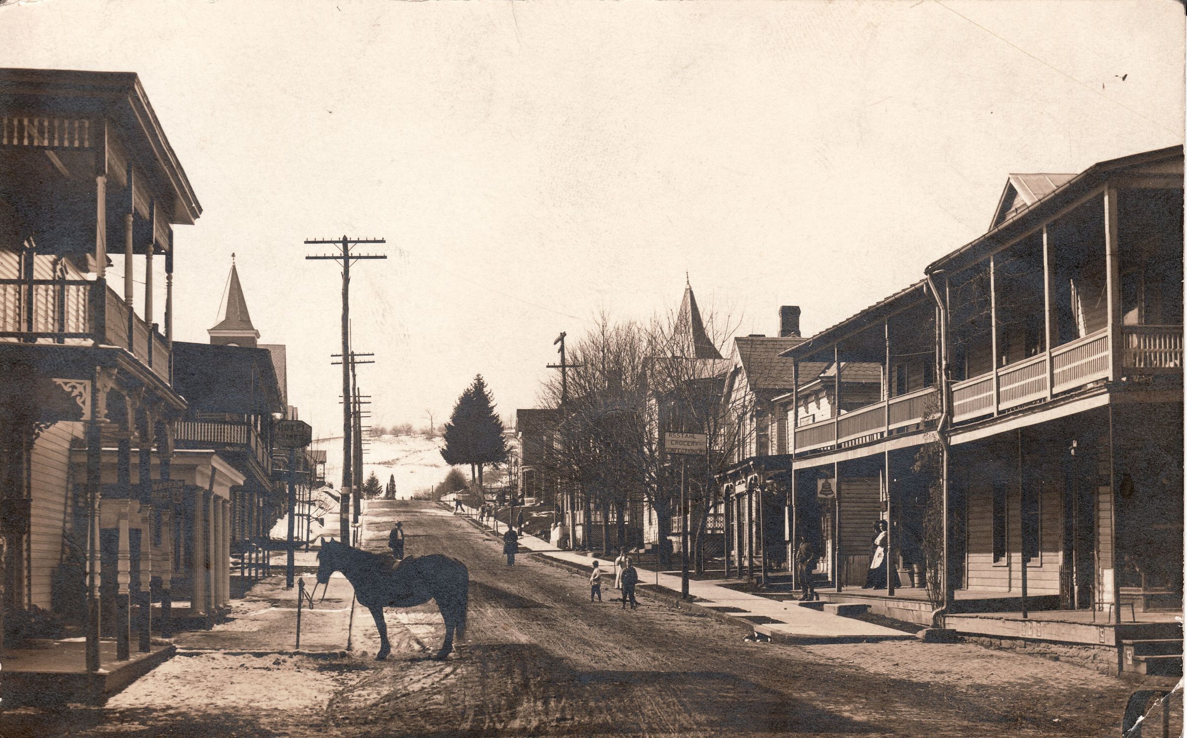 On the left side of the street, the tall sign reads, "Hotel / Proprietor / D. Sanders." The initial indicates Dennis Sanders [1840-1918], a Civil War veteran, whose occupation is listed as hotel proprietor in the U.S. Federal Census of 1910.