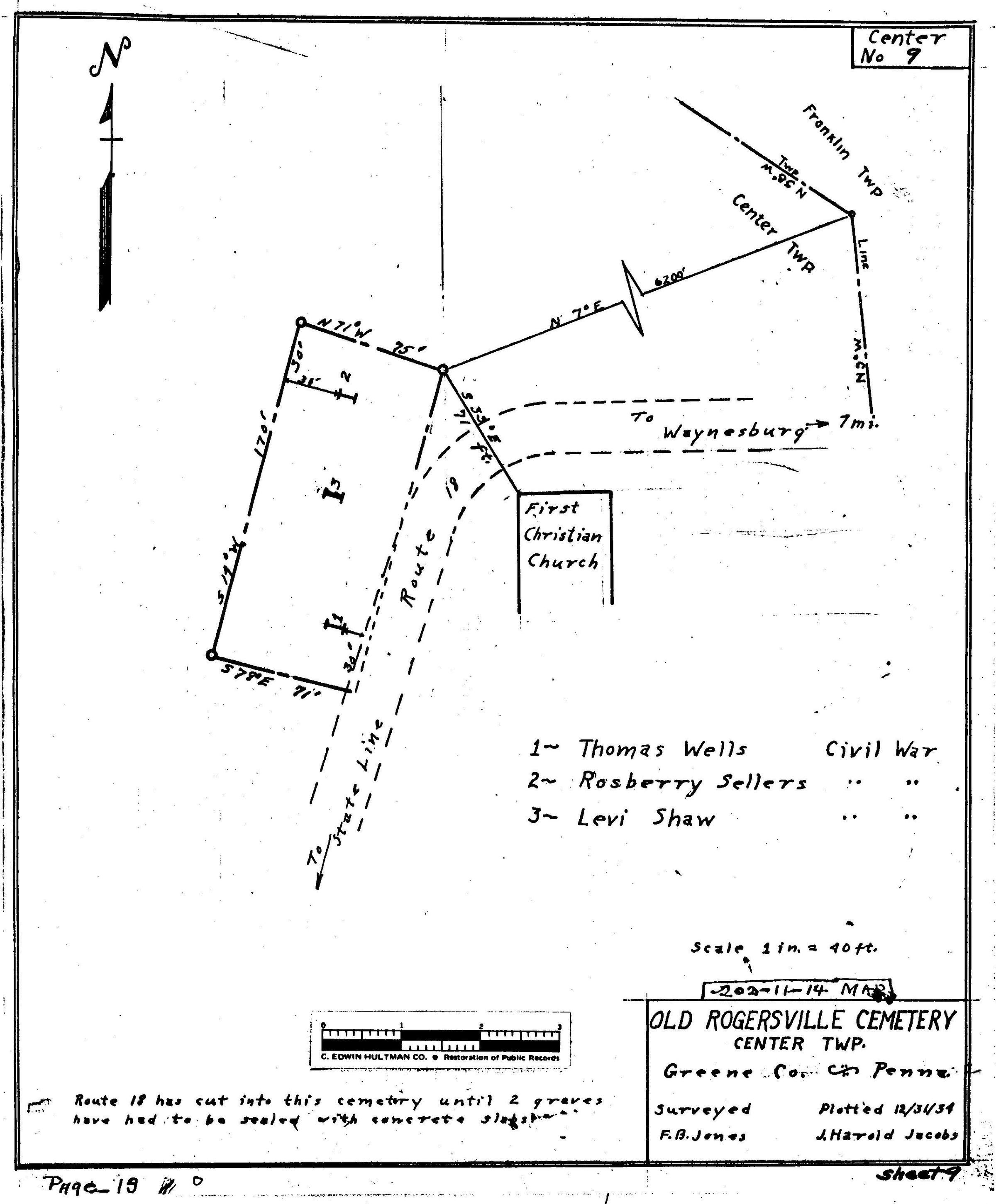 Source Citation: WPA Cemetery Plat - Pennsylvania - Greene County - Center Township - Rogersville Cemetery (1934), item no. 2016.3.35, Cemetery Plat (WPA) Collection, surveyed by Works Projects Administration, copy on file at the Clerk of Courts Office, Greene County Courthouse, Greene Connections Archives Project (www.GreeneConnections.com).