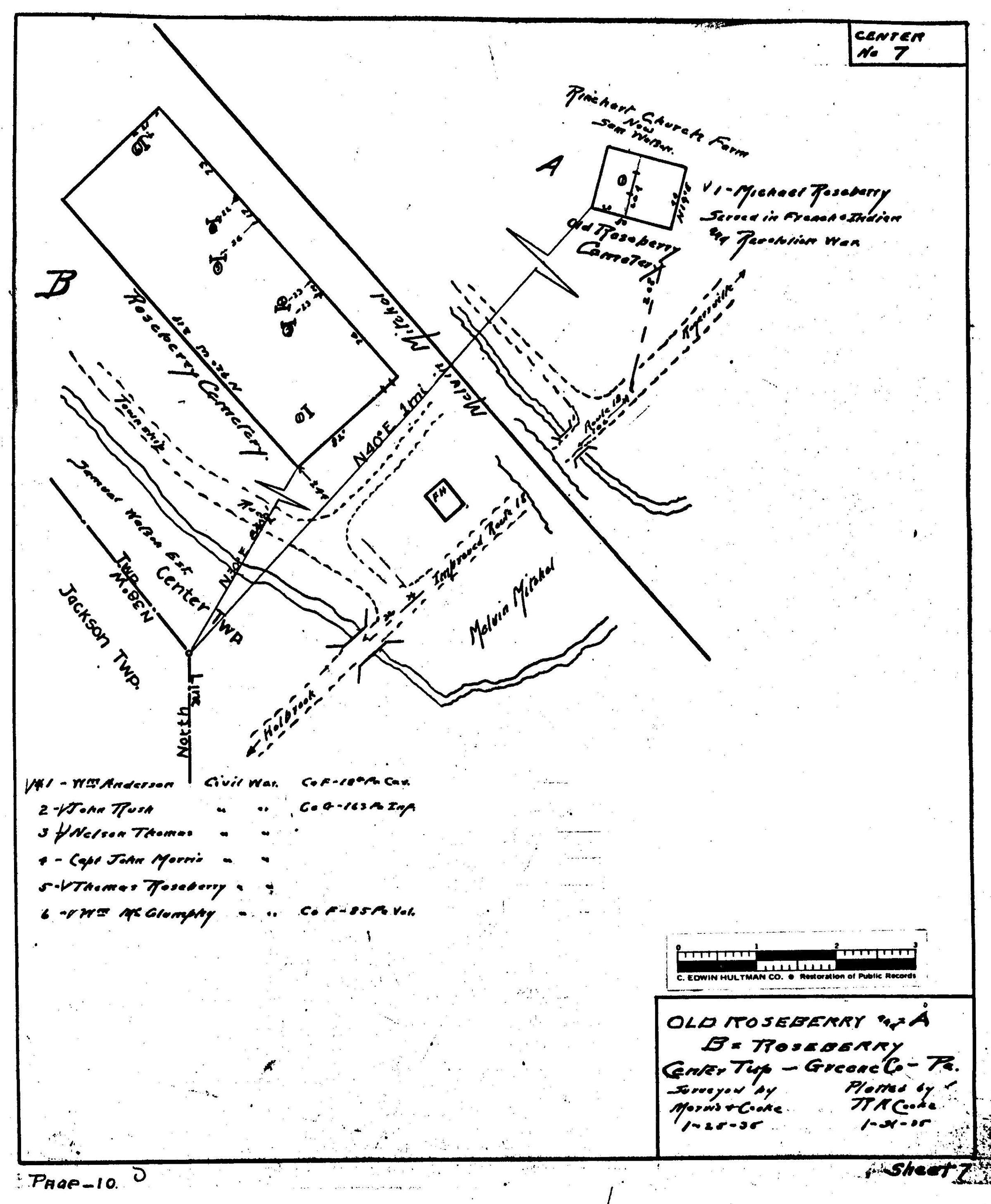 Source Citation: WPA Cemetery Plat - Pennsylvania - Greene County - Center Township - Roseberry Cemetery (1935), item no. 2016.3.36, Cemetery Plat (WPA) Collection, surveyed by Works Projects Administration, copy on file at the Clerk of Courts Office, Greene County Courthouse, Greene Connections Archives Project (www.GreeneConnections.com).