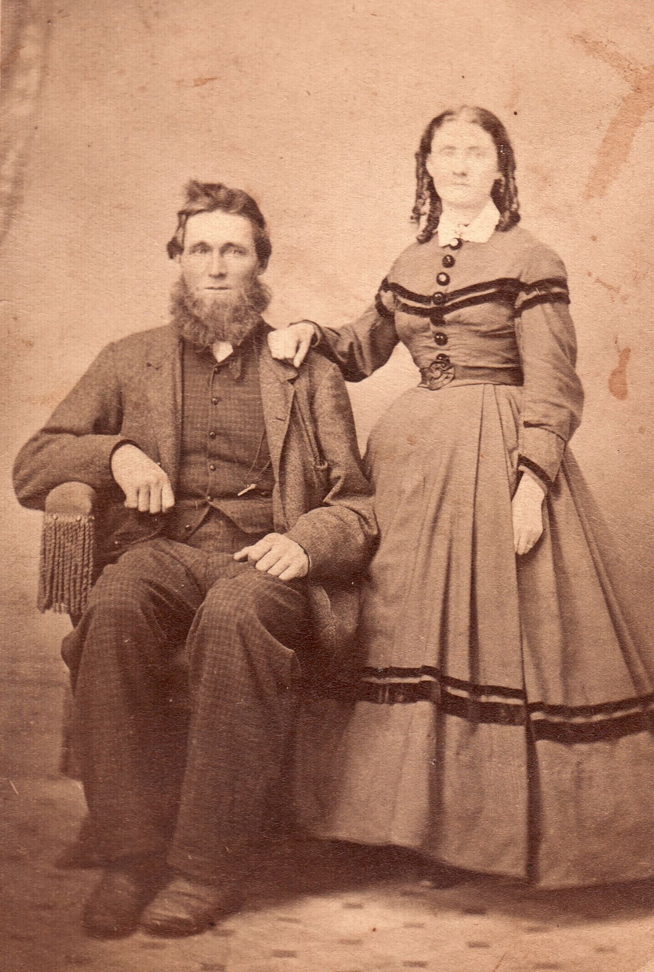 SOURCE CITATION: Samuel Moredock [1835-1915] and his wife, Nancy Jane (Riggle) Moredock [1840-1915]; circa 1865-1875, image by S. G. Rogers, Photographic Gallery, Carmichaels, Greene Co., Pa.; item no. CGSP_AN006_0004_0018, Esther Ruth Hart Series, Cornerstone Genealogical Society Collection; Greene Connections Archives Project (GreeneConnections.com).