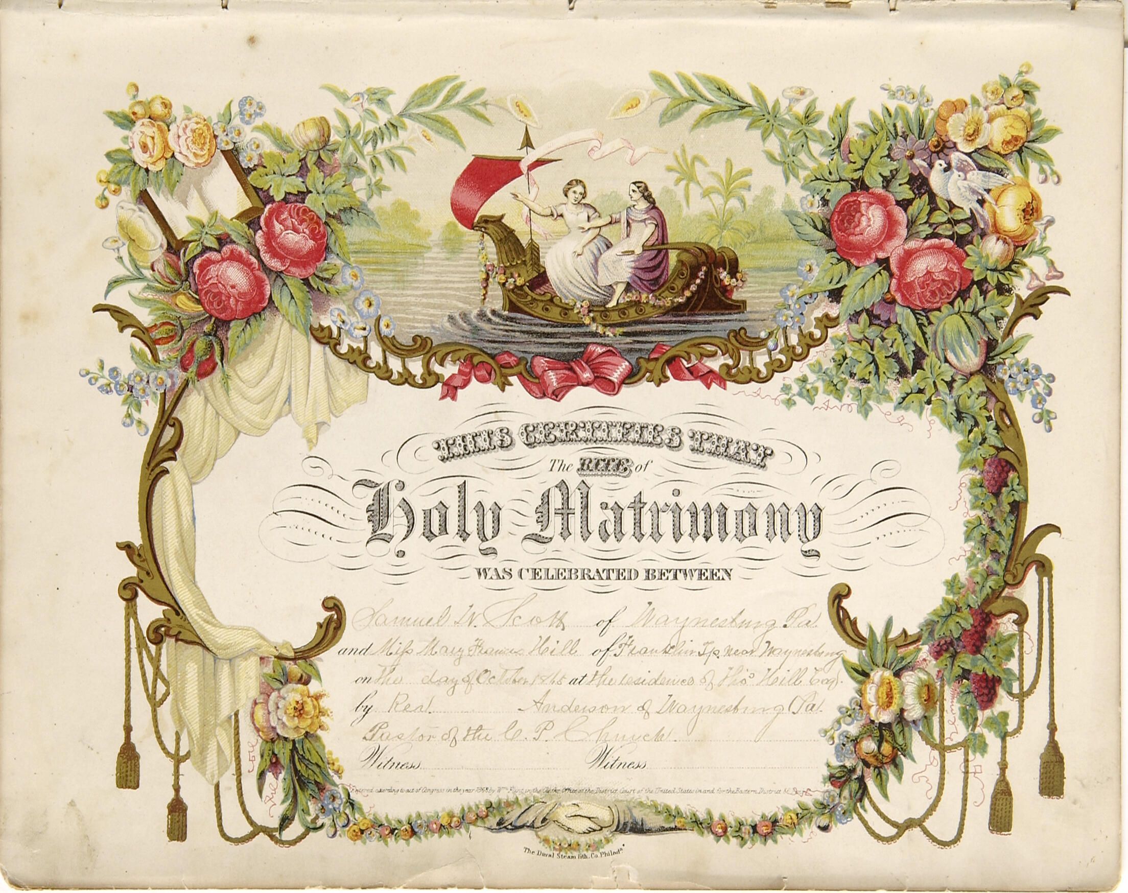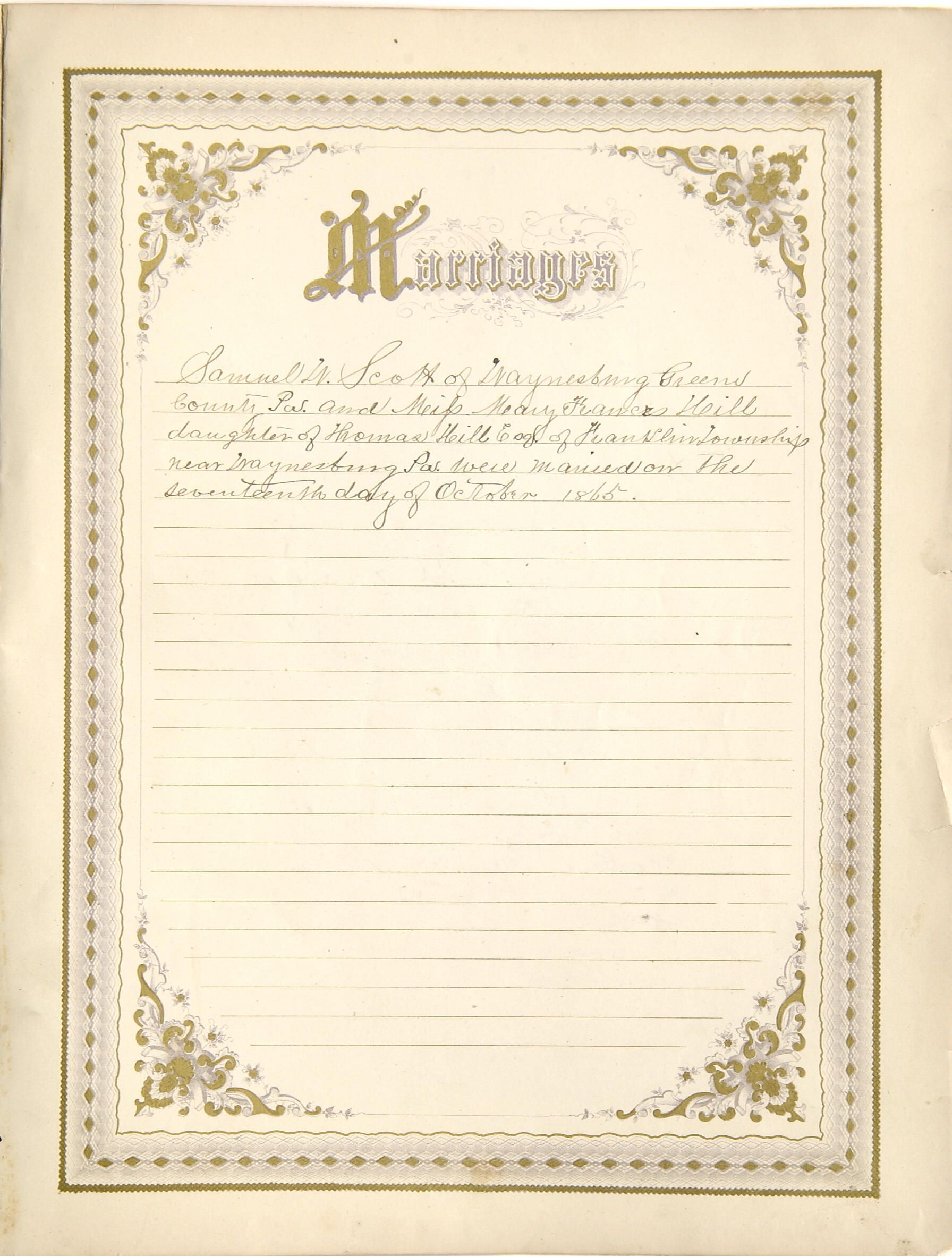 "THIS CERTIFIES THAT / THE RITE OF / HOLY MATRIMONY / WAS CELEBRATED BETWEEN / Samuel W. Scott of Waynesburg Pa. / and Miss Mary Francis Hill of Franklin Tp. near Waynesburg / on the [blank] day of October 1865 at the residence of Thos. Hill Esq. / by Rev. Anderson of Waynesburg Pa. / Pastor of the C. P. Church."