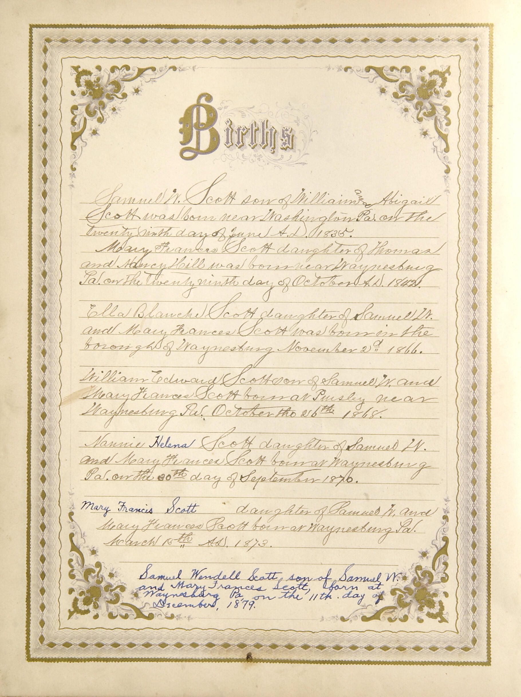 Mary Francis Scott daughter of Samuel W. and / Mary Frances Scott born at Waynesburg Pa. / March 15th A. D. 1873.