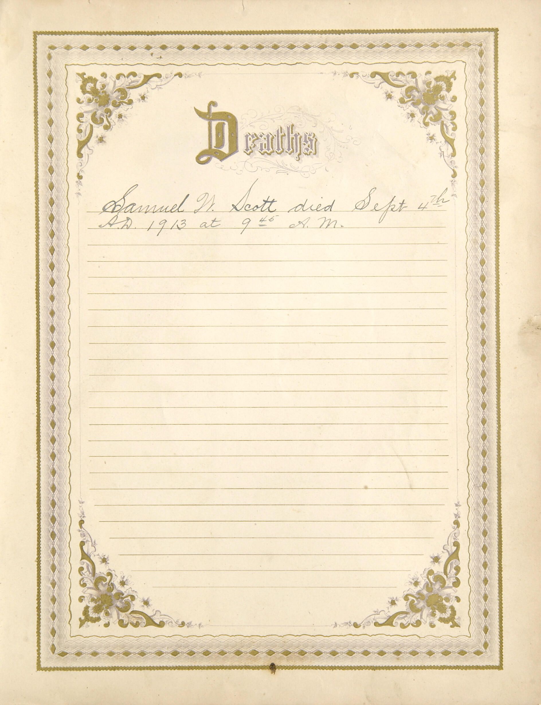 "Samuel W. Scott died Sept. 4th / A. D. 1913 at 9:45 A. M."Collection