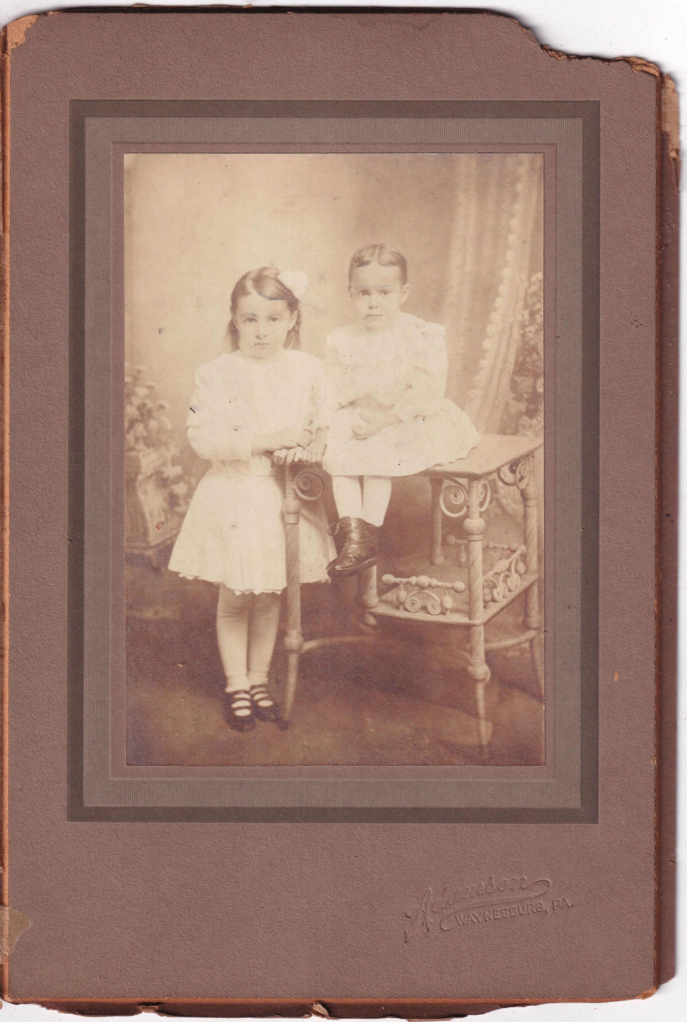 SOURCE CITATION: [Left-Right]: Sarah Helen Cree [1907-2004] and Anna Pauline (Cree) Schroyer [1909-1972]; circa 1910-1912, image by Adamson, Waynesburg, Pa.; item no. MORS-AN004-0004, Cree Series, Ruth Cecilia (Morris) (Shultz) Minor Collection; Greene Connections Archives Project (GreeneConnections.com).
