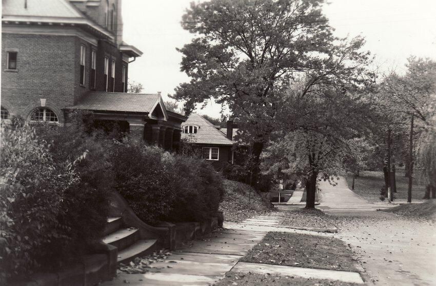 In the left-foreground, located on the southeast corner of Wayne and Morris Streets, stands Sayers Manor. Sayers Manor is named for the Lewis Wetzel Sayers Sr. family who lived there in the late 1800s - early 1900s. The property had formerly belonged to Alfred Brashear and Margaret Kerr (Bell) Miller, early leaders of Waynesburg College. The house faced College Park across Wayne Street.