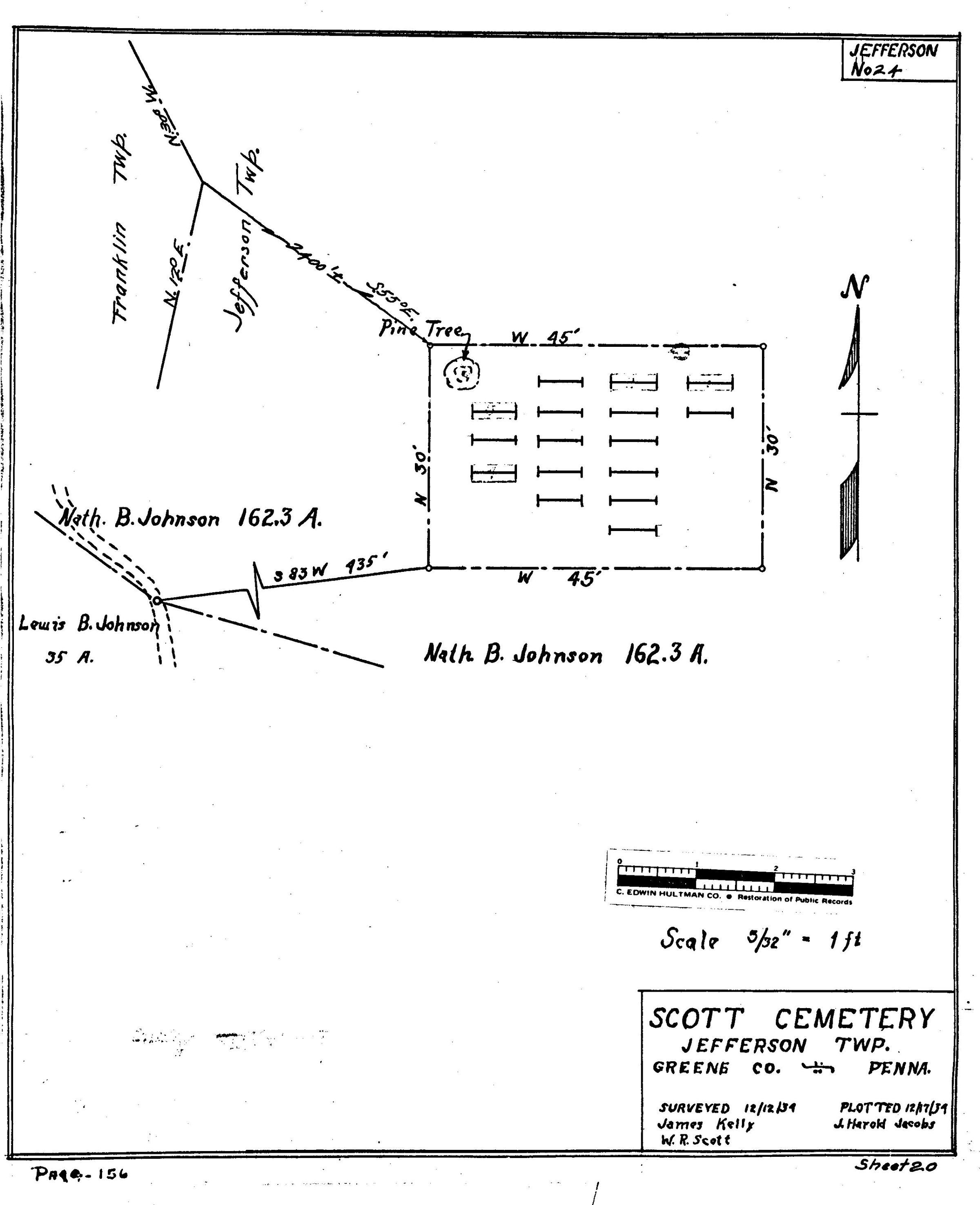 SOURCE CITATION: WPA Cemetery Plat - Pennsylvania - Greene County - Jefferson Township - Scott Cemetery (1934); item no. 2016.3.398, Cemetery Plat (WPA) Collection, surveyed by Works Projects Administration, copy on file at the Clerk of Courts Office, Greene County Courthouse; Greene Connections Archives Project (GreeneConnections.com).