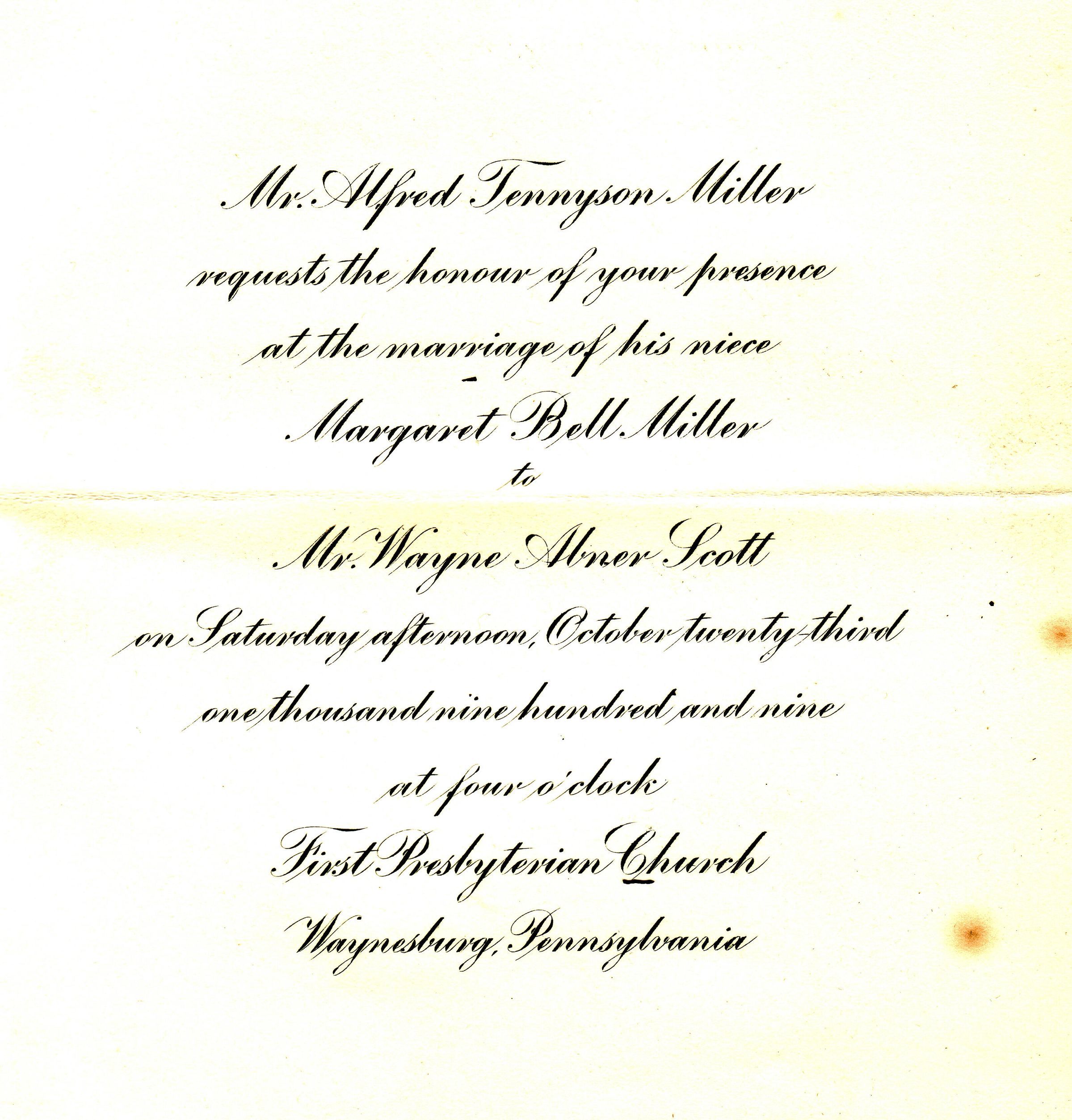 Source Citation: Scott-Miller wedding invitation, item no. MERR-AN004-0002-0023, Robert Silas and Eva Mae (Christie) Merrick Collection, shared by Peter Merrick, Greene Connections Archives Project (www.GreeneConnections.com).