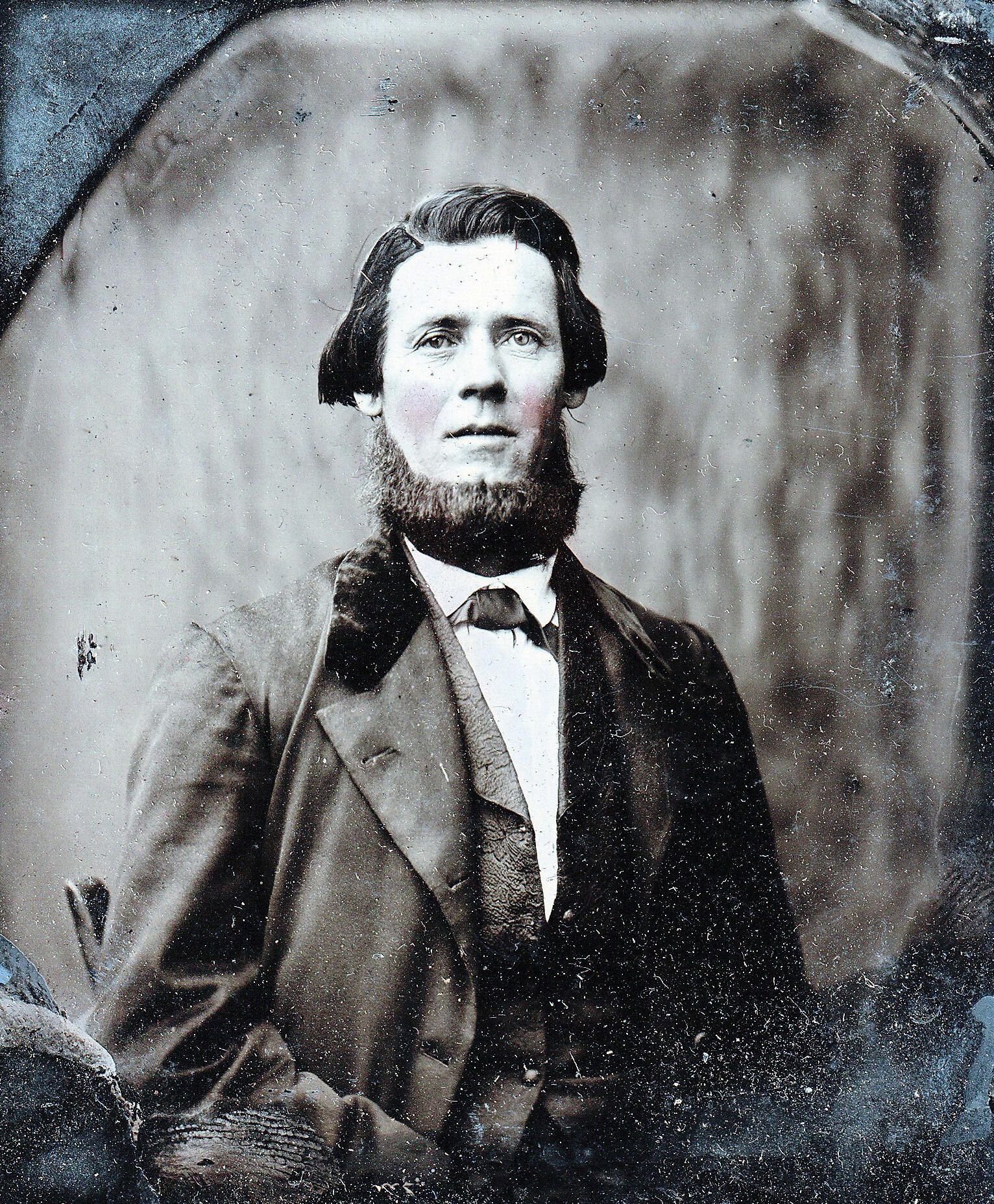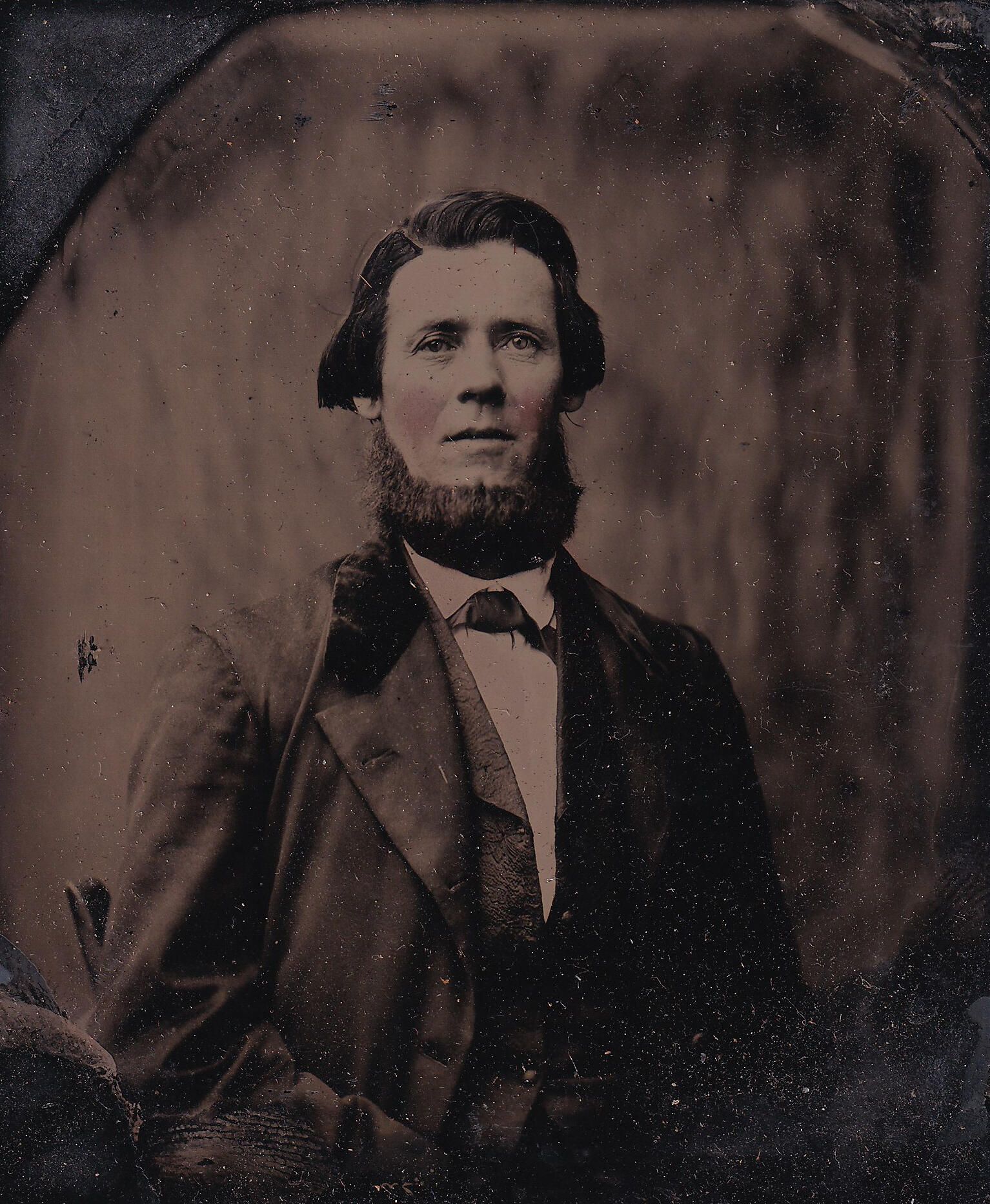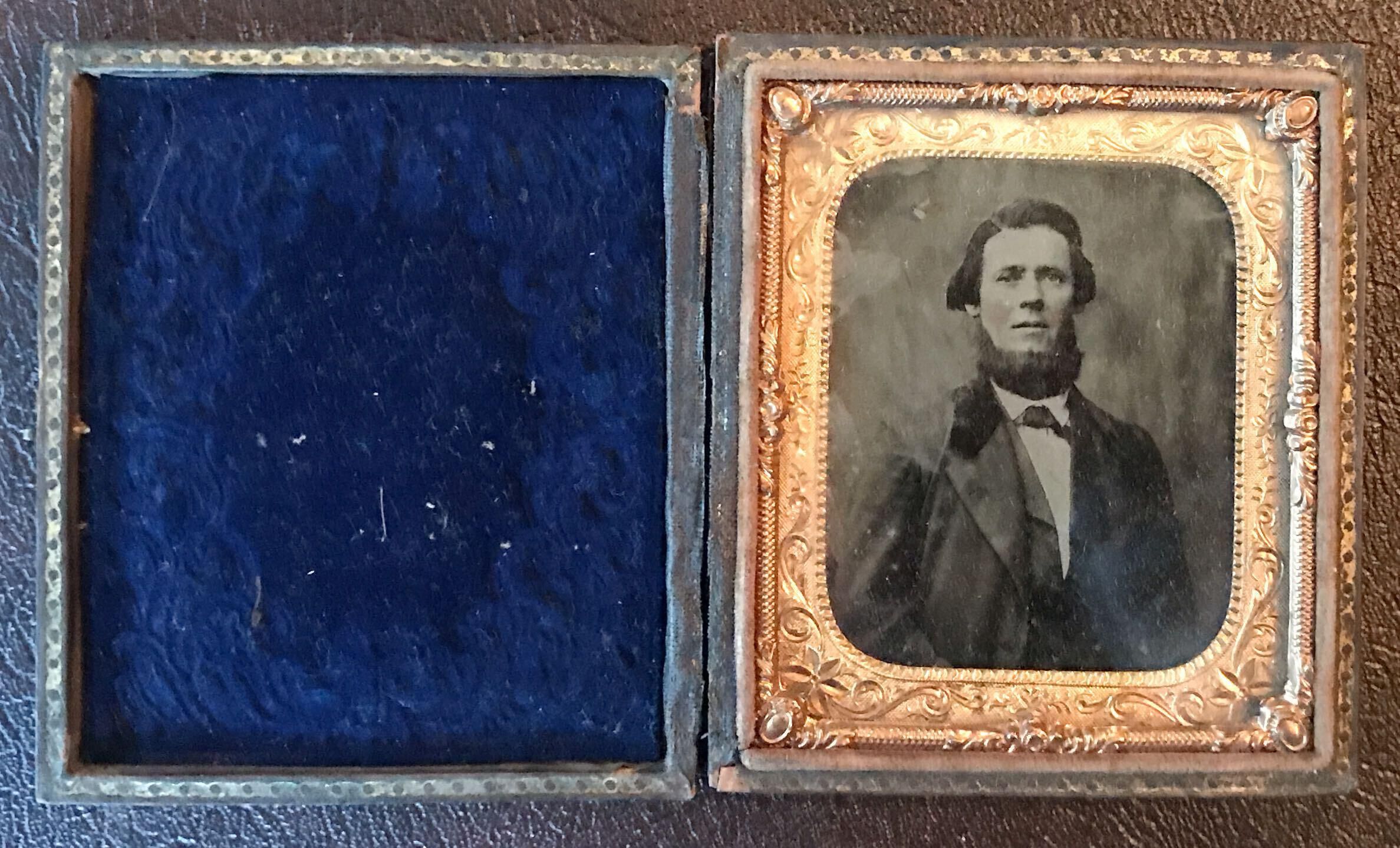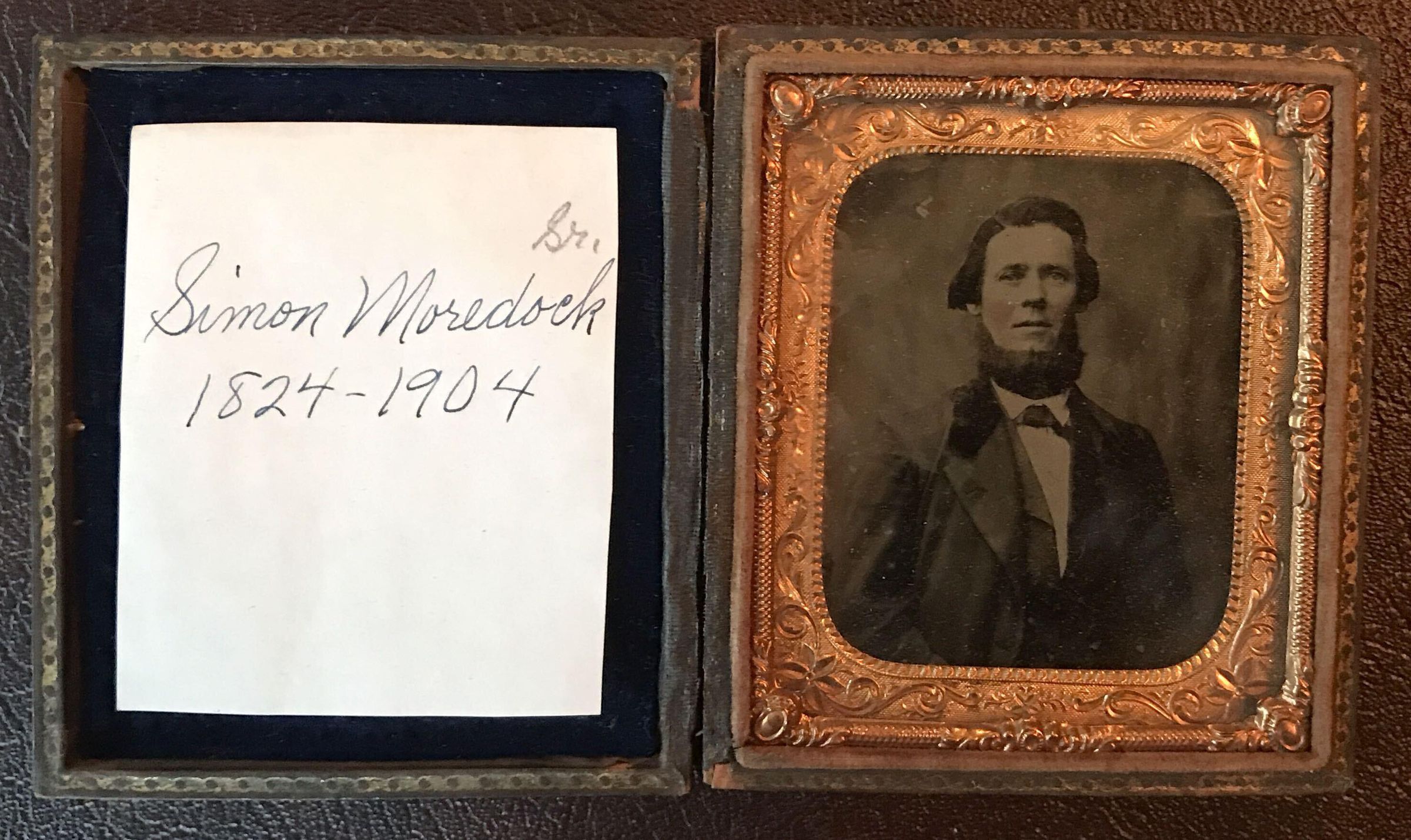 SOURCE CITATION: Cased tintype of Simon Moredock [1824-1904] - husband of Mary Jane Reynolds, son of George Moredock and Priscilla Anderson; circa 1864-1865; item no. MORE-AN007-0001, Moredock Series, Ammons-Moredock Collection, Greene Connections Archives Project (www.GreeneConnections.com).