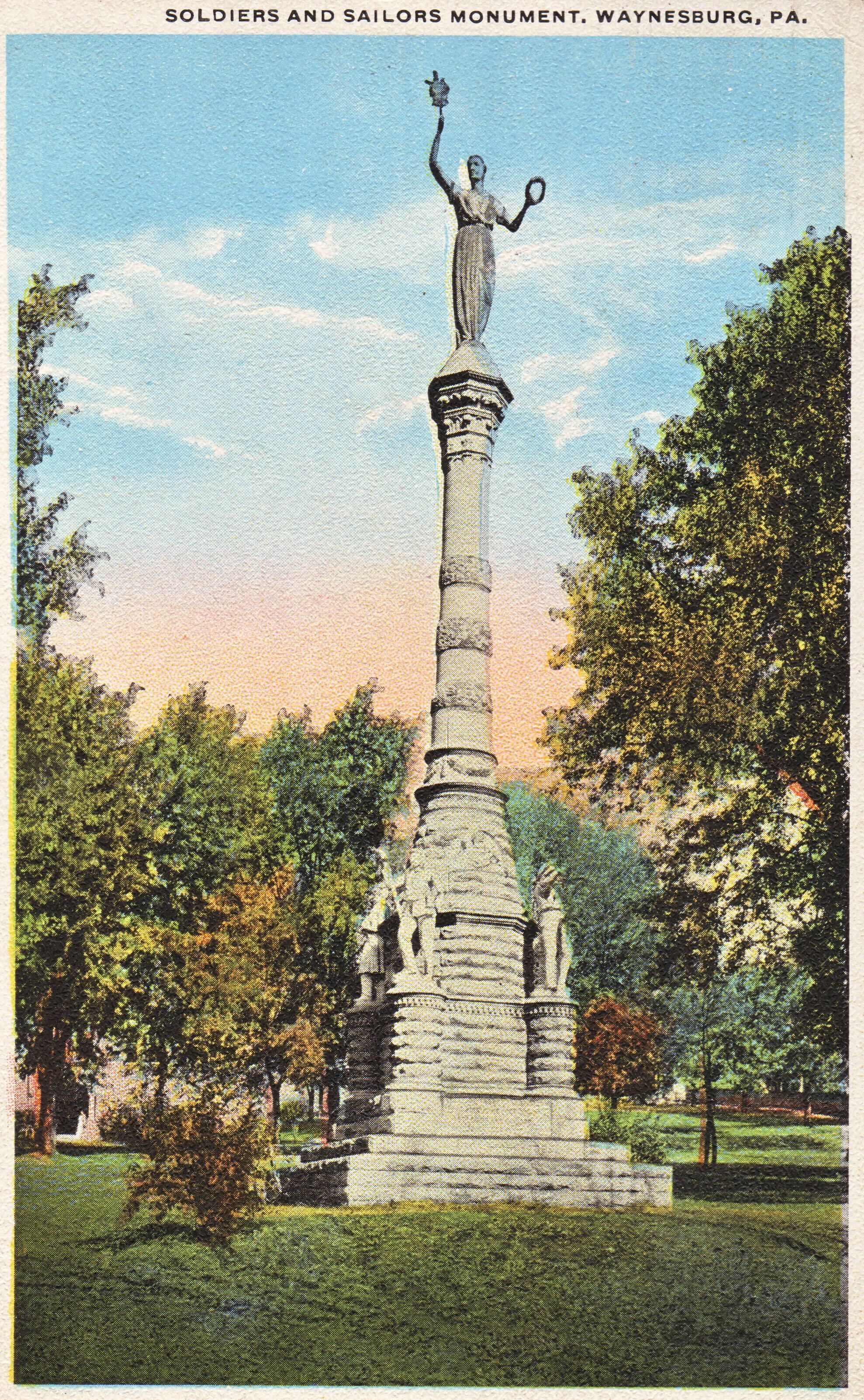 Postcard of the Soldiers and Sailors Monument in Monument Park, Waynesburg, Greene County, Pennsylvania.