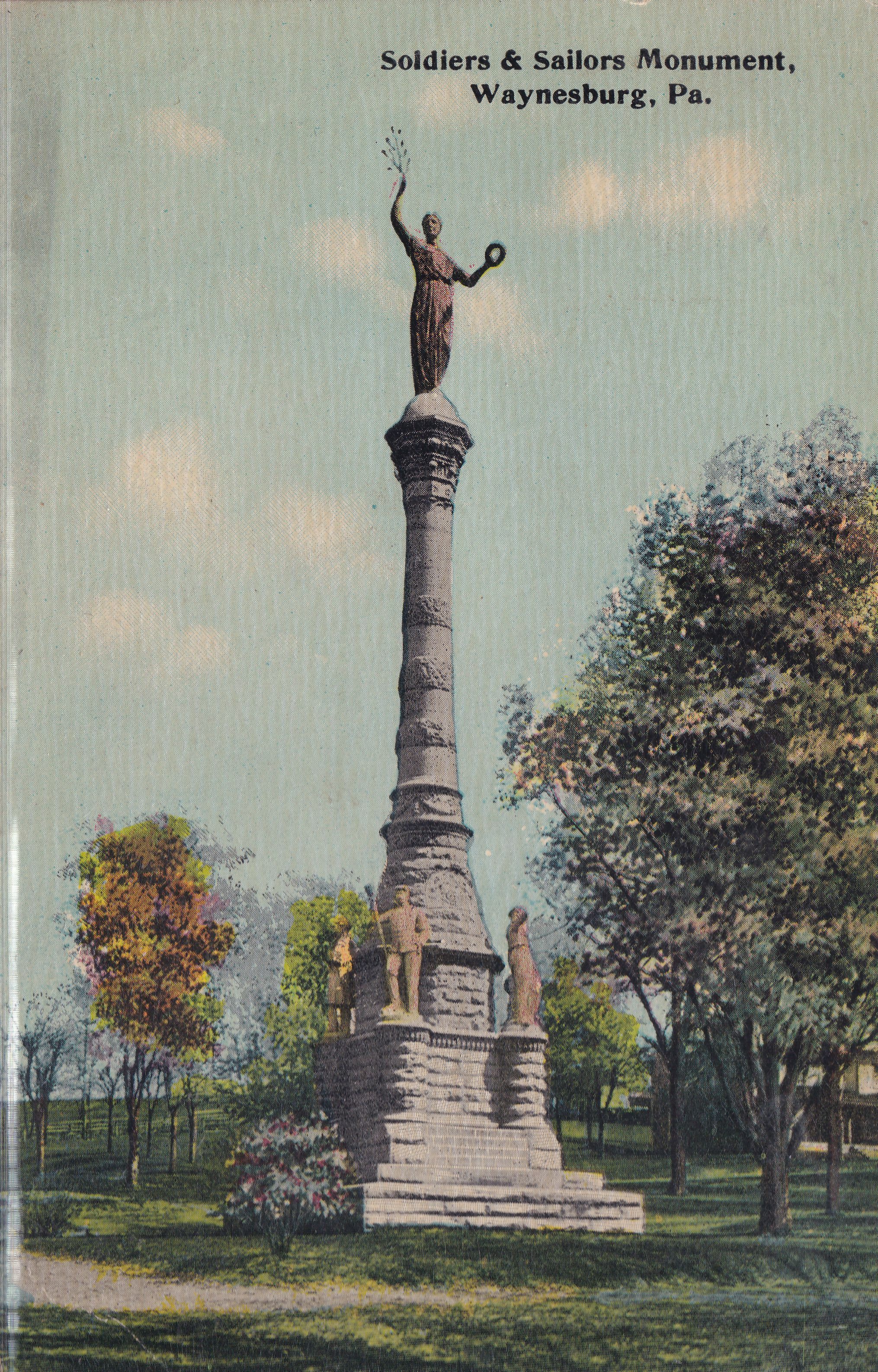 SOURCE CITATION: Soldiers and Sailors Monument in Monument Park at Waynesburg, Greene County, Pennsylvania; circa 1910; item no. MILB-AN001-0005-0015, Mary (Vance) McCann Collection, shared by her grandson, William Marshall Miller; Greene Connections Archives Project (www.GreeneConnections.com).