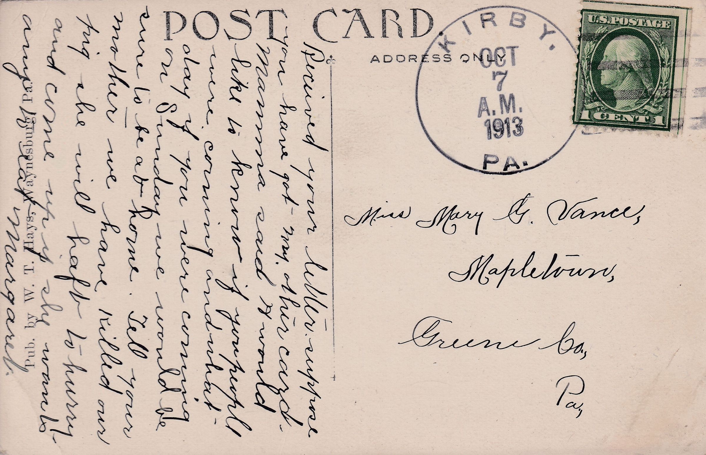 The Mary (Vance) McCann Collection was passed from George Birch Vance [1870-1928] and Jessie Dell (McFarland) Vance [1868-1935] with the ownership of their home in Mapletown, Monongahela Township, Greene County, Pennsylvania, to their daughter, Mary (Vance) McCann [1898-1987], and her husband, Marshall Albert McCann [1895-1956]. Mary (Vance) McCann left the collection to her grandson, William Marshall Miller, who owned and shared the collection with the Greene Connections: Greene County, Pennsylvania Archives Project in 2023.