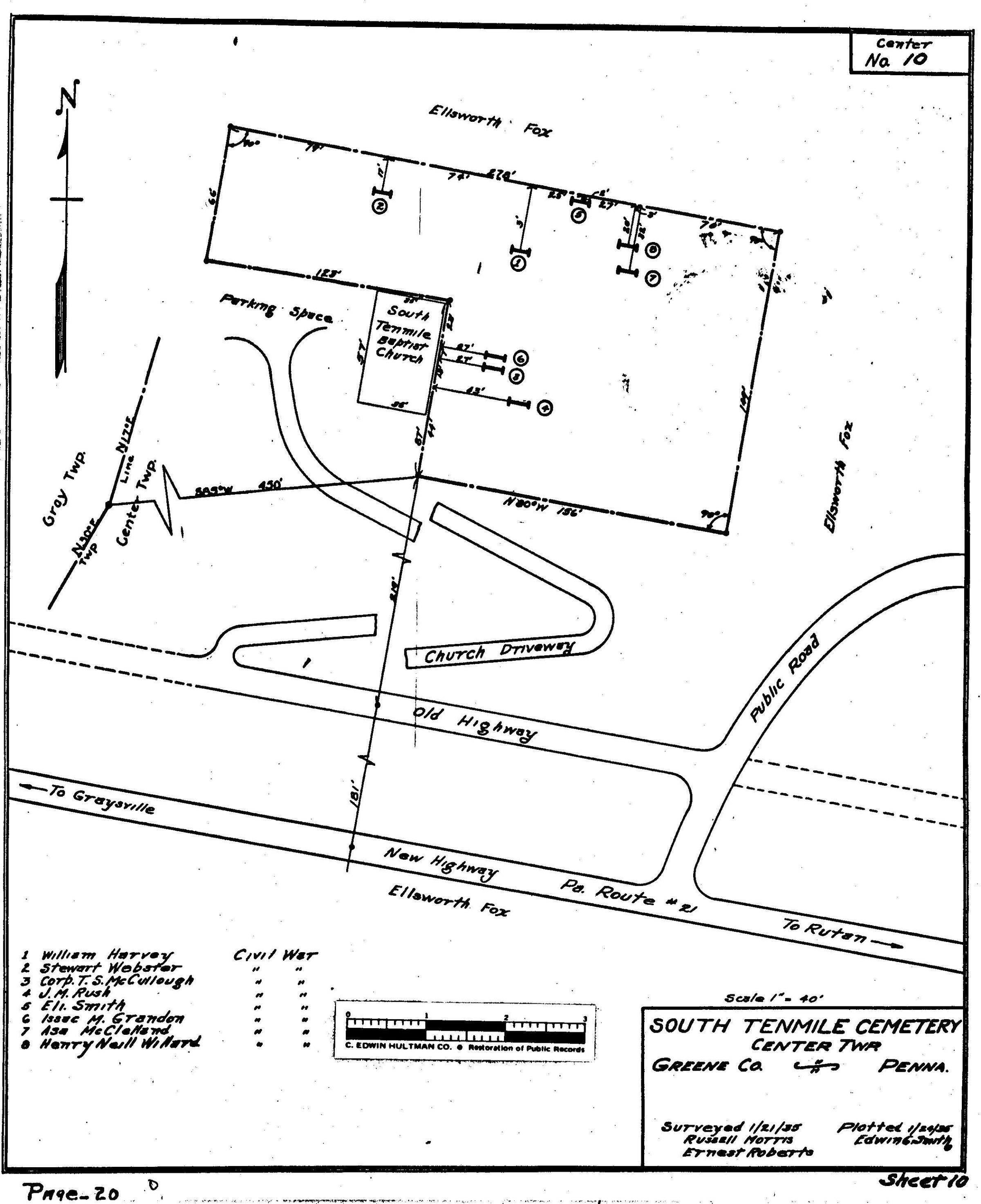 Source Citation: WPA Cemetery Plat - Pennsylvania - Greene County - Center Township - South Tenmile Cemetery (1935), item no. 2016.3.42, Cemetery Plat (WPA) Collection, surveyed by Works Projects Administration, copy on file at the Clerk of Courts Office, Greene County Courthouse, Greene Connections Archives Project (www.GreeneConnections.com).