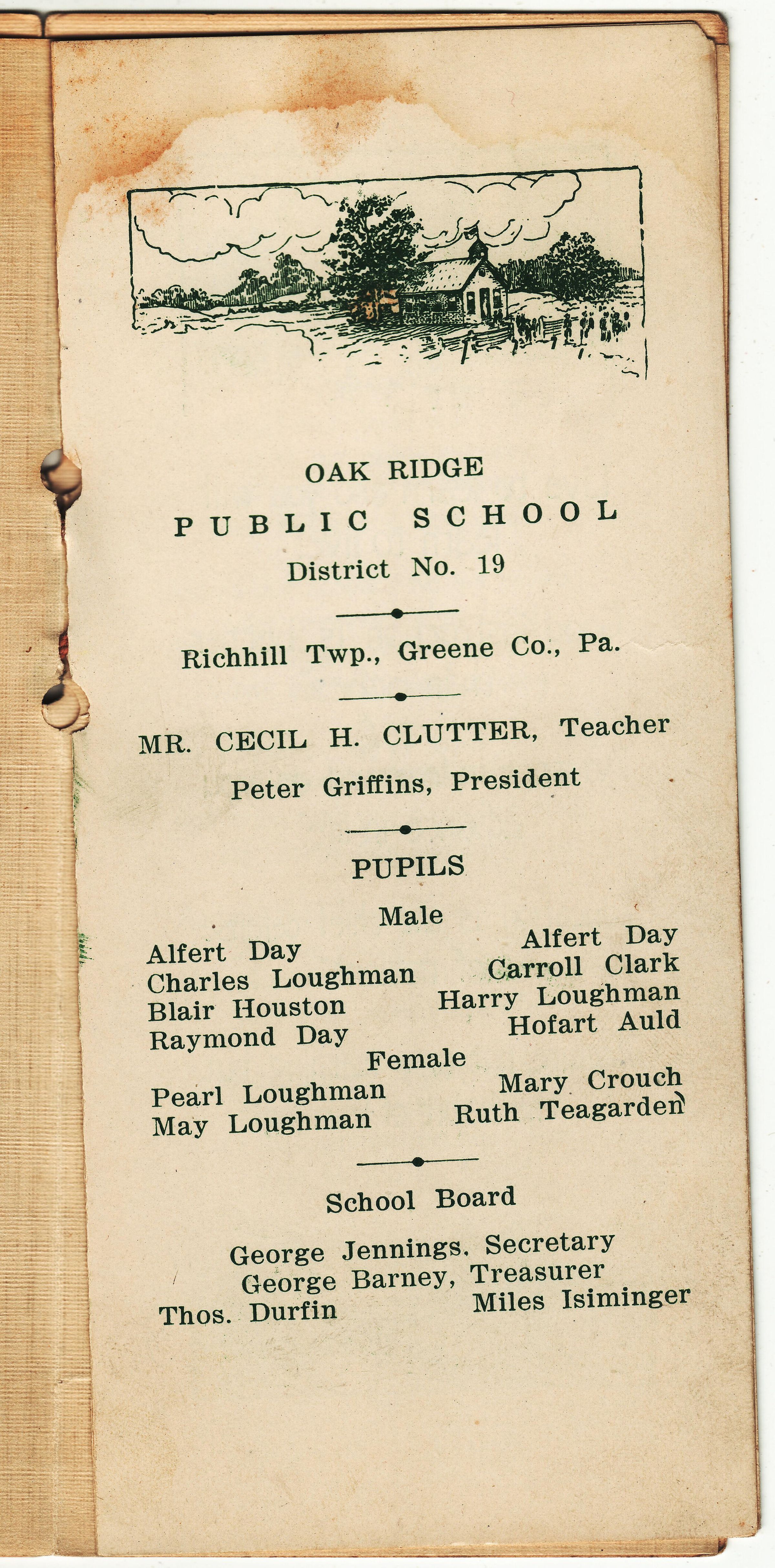 Source Citation: Souvenir program presented by Cecil H. Clutter, Teacher - Oak Ridge Public School, District No. 19, Richhill Township, Greene County, Pennsylvania; printed by Ohio Ptg. Co., N. Phila., O., dated 1917; item no. SUPL-AN007-0001, School Series, Wayne Carl Swart Collection, Greene Connections Archives Project (www.GreeneConnections.com).
